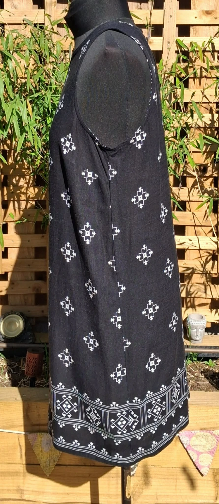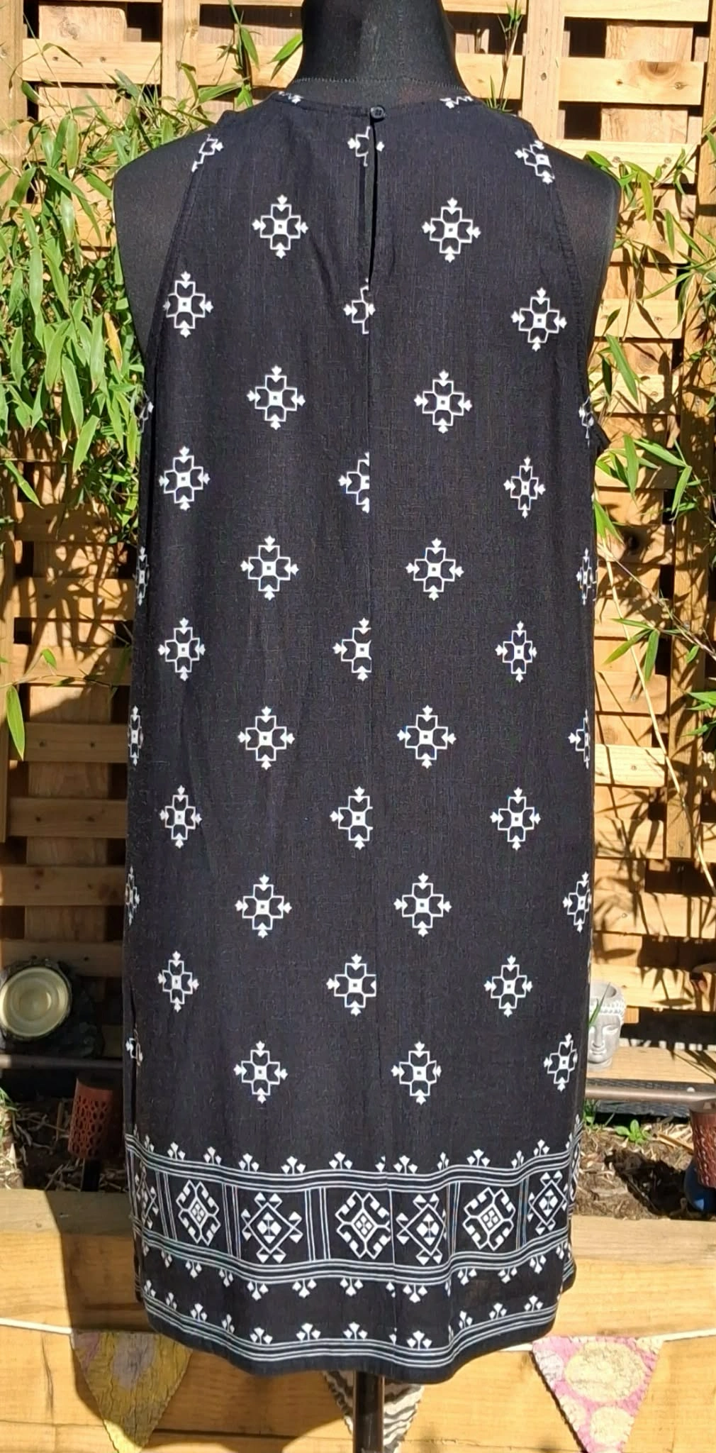 fabulous, black linen dress, with a white block pattern, with a button fastening at the back of the dress, comfy to wear.