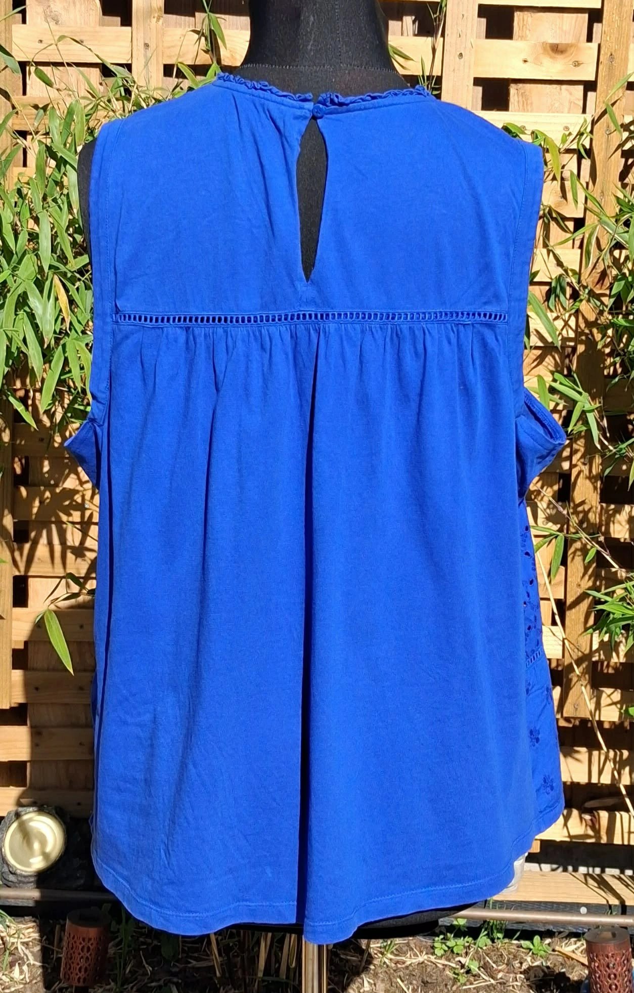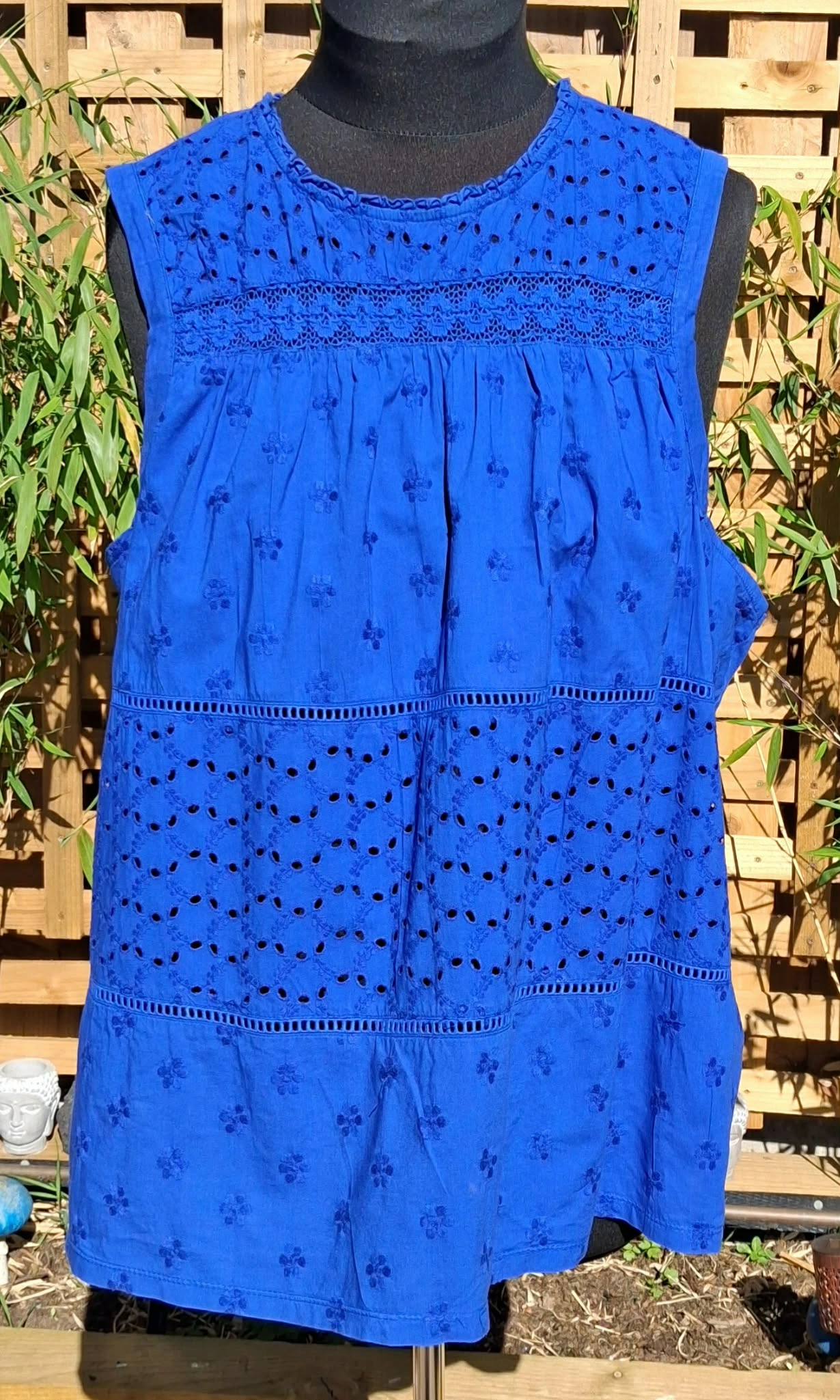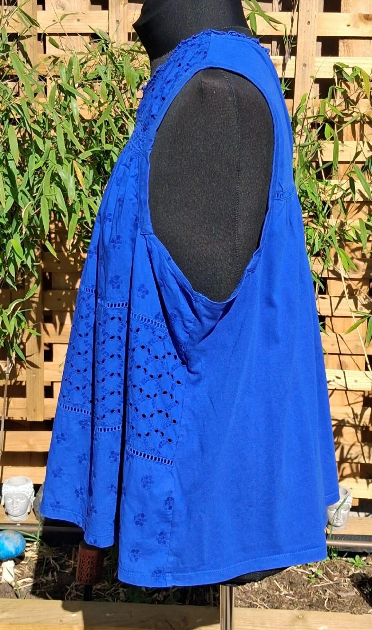 beautiful, blue, sleeveless vest top, curvy size, embroidered flowers, amazing colour, super comfy to wear.