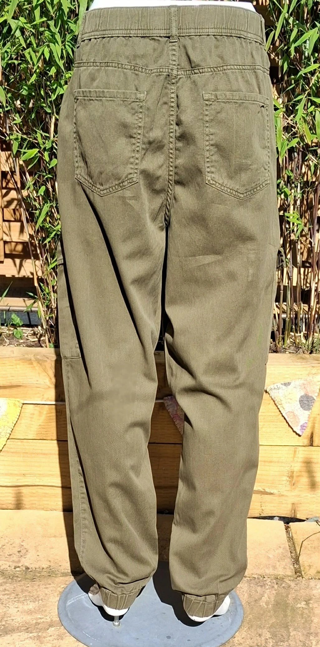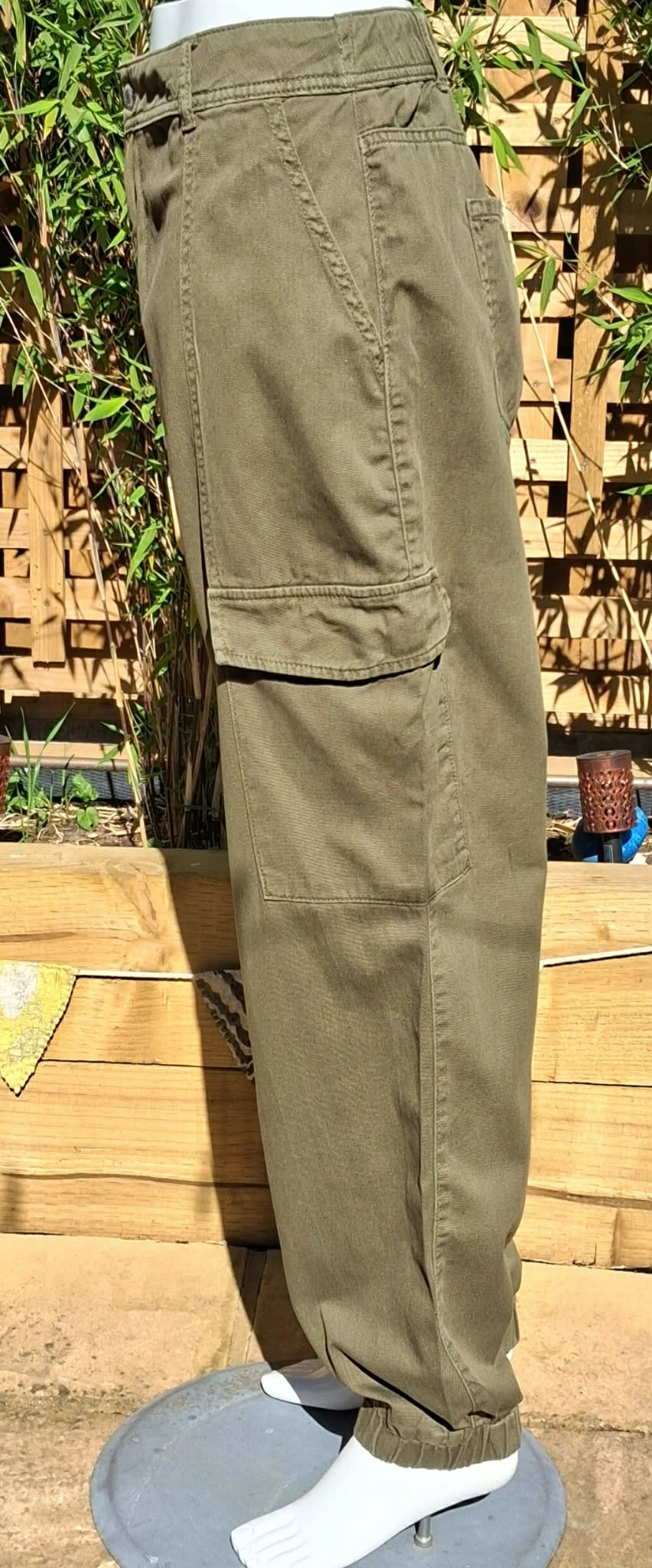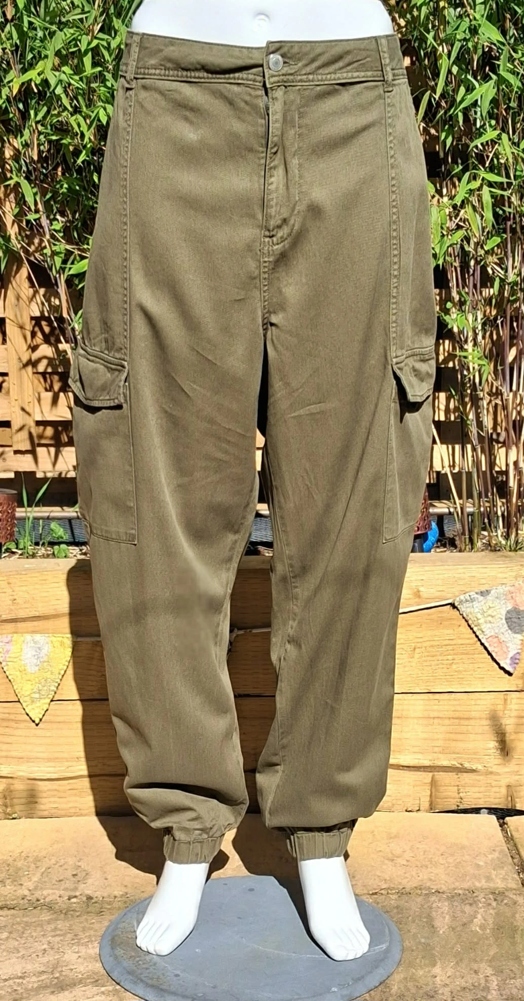 green, cargo trousers, cuffed ankles, button and zip fastening, elasticated at the back for comfort, 2 leg pockets, and 4 other pockets.