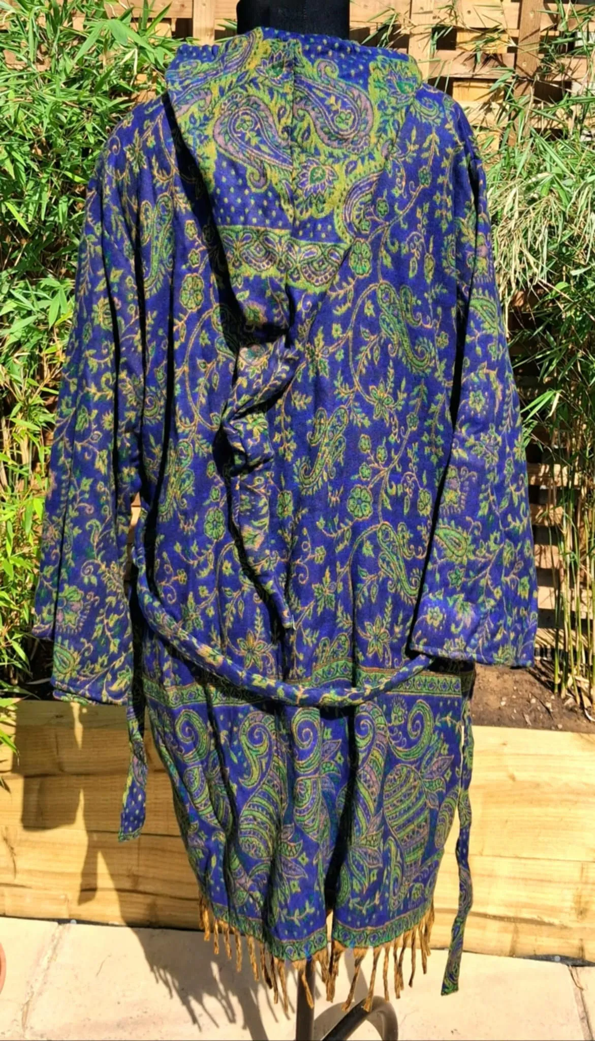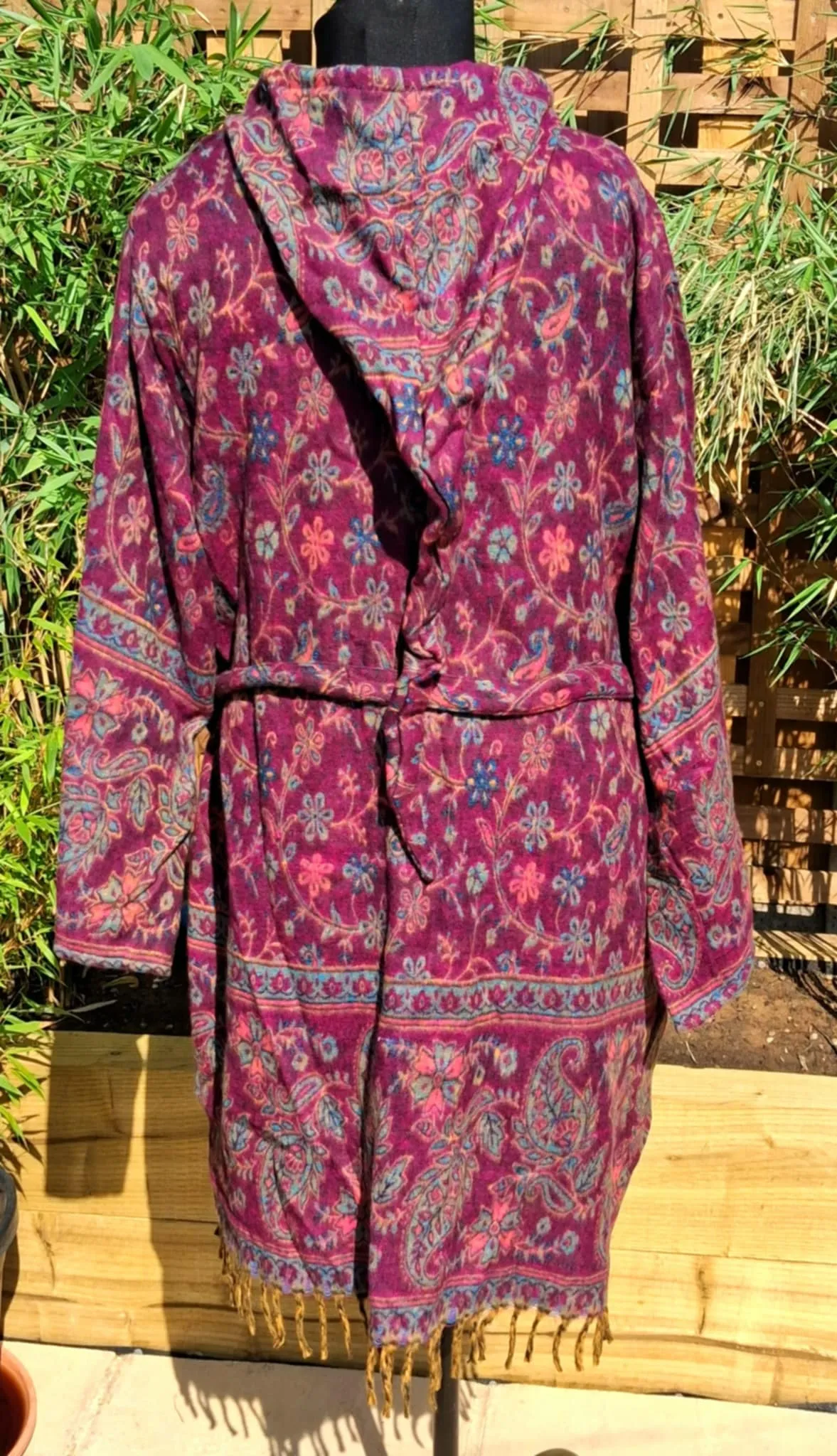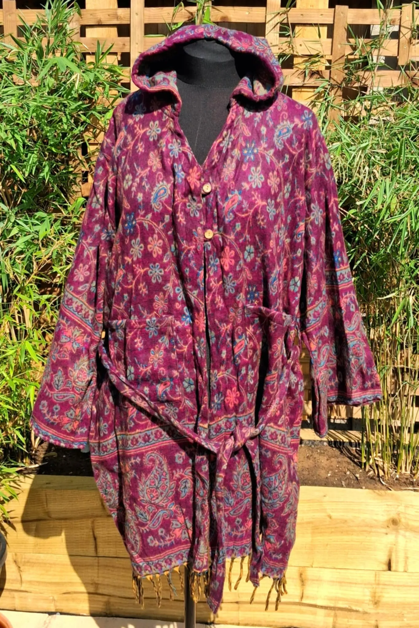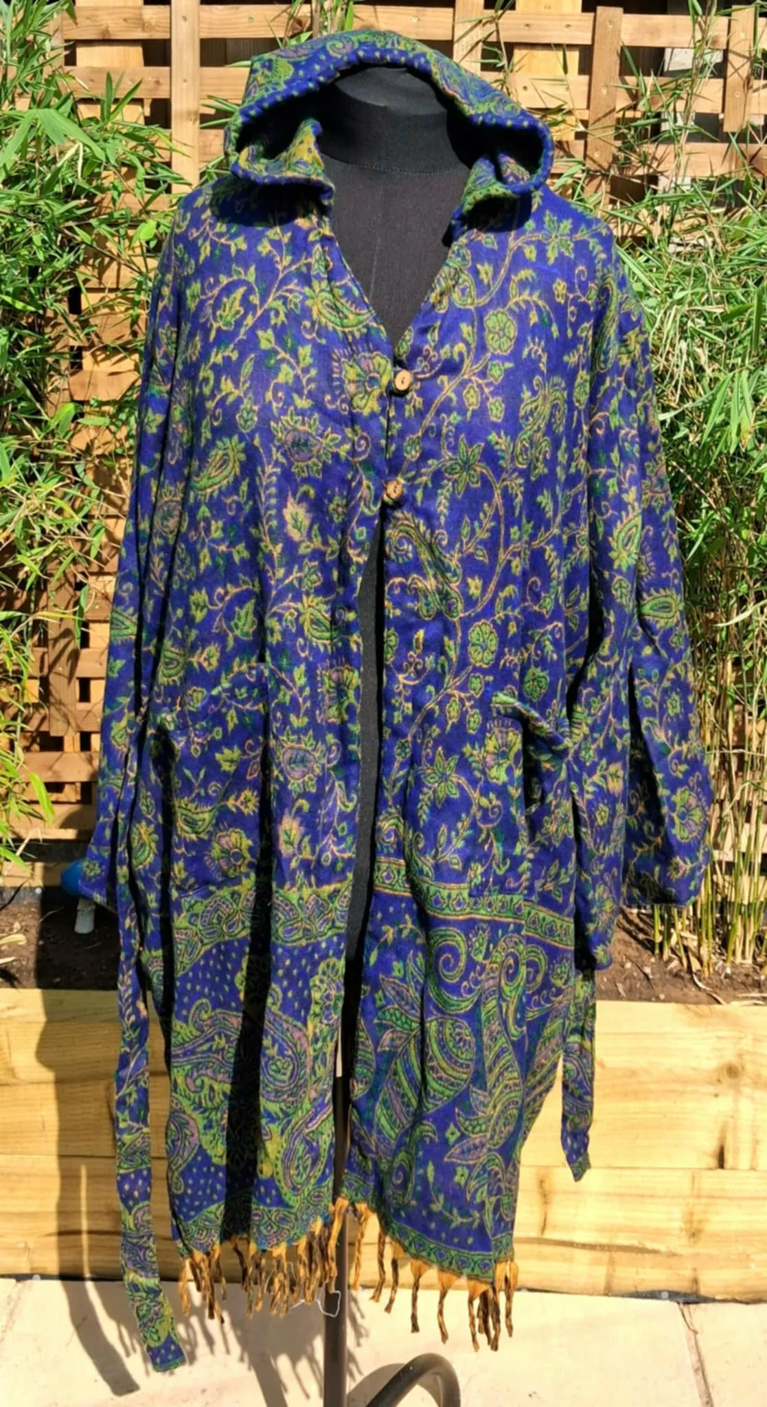 Beautiful , curvy size, blanket overthrows with a pixie hood, features a tie belt, 2 button fastening, 2 pockets and a fabulously long pixie hood. finished with tassels at the bottom.