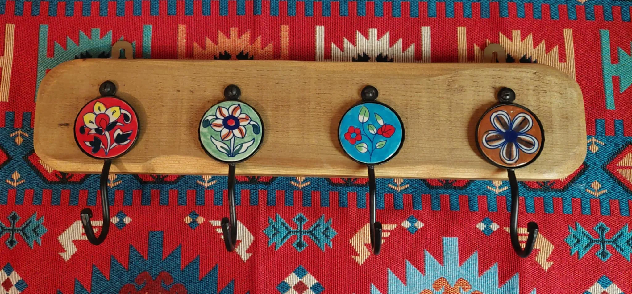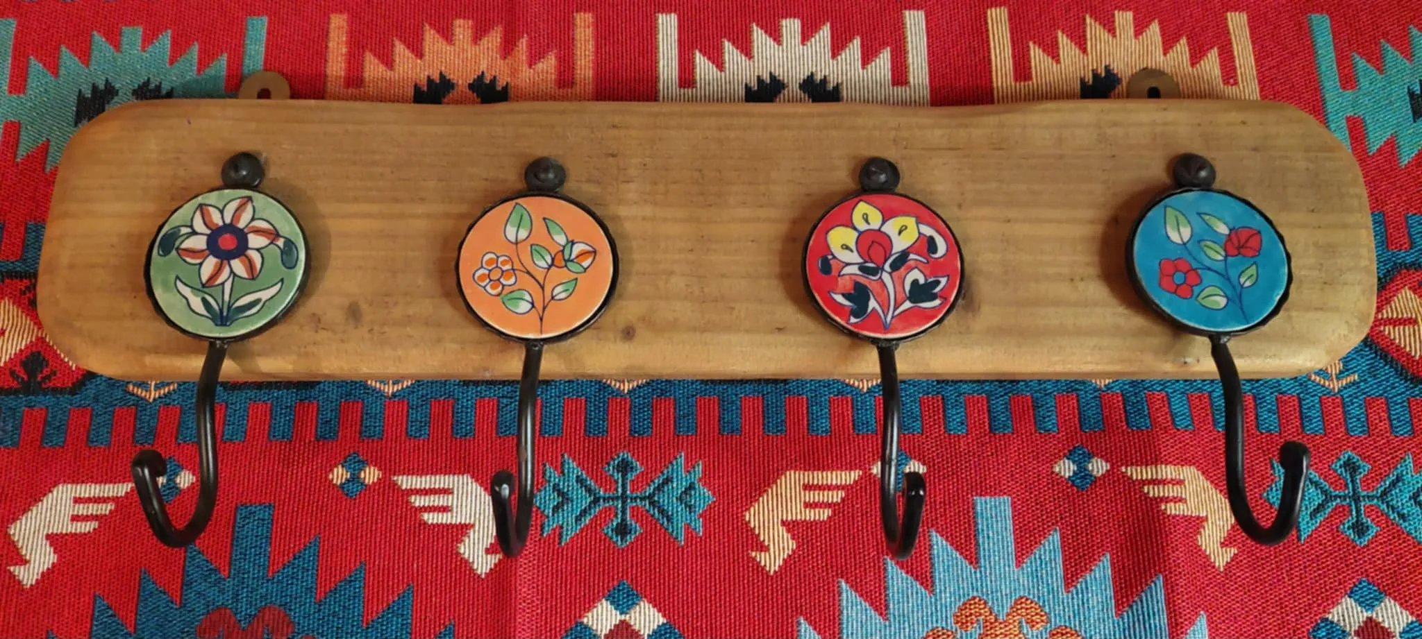 Handmade, here at the little hippie shop, beautiful, 4 hook holder, great for tea towels, small coats, jewellery etc. finished with a wax.