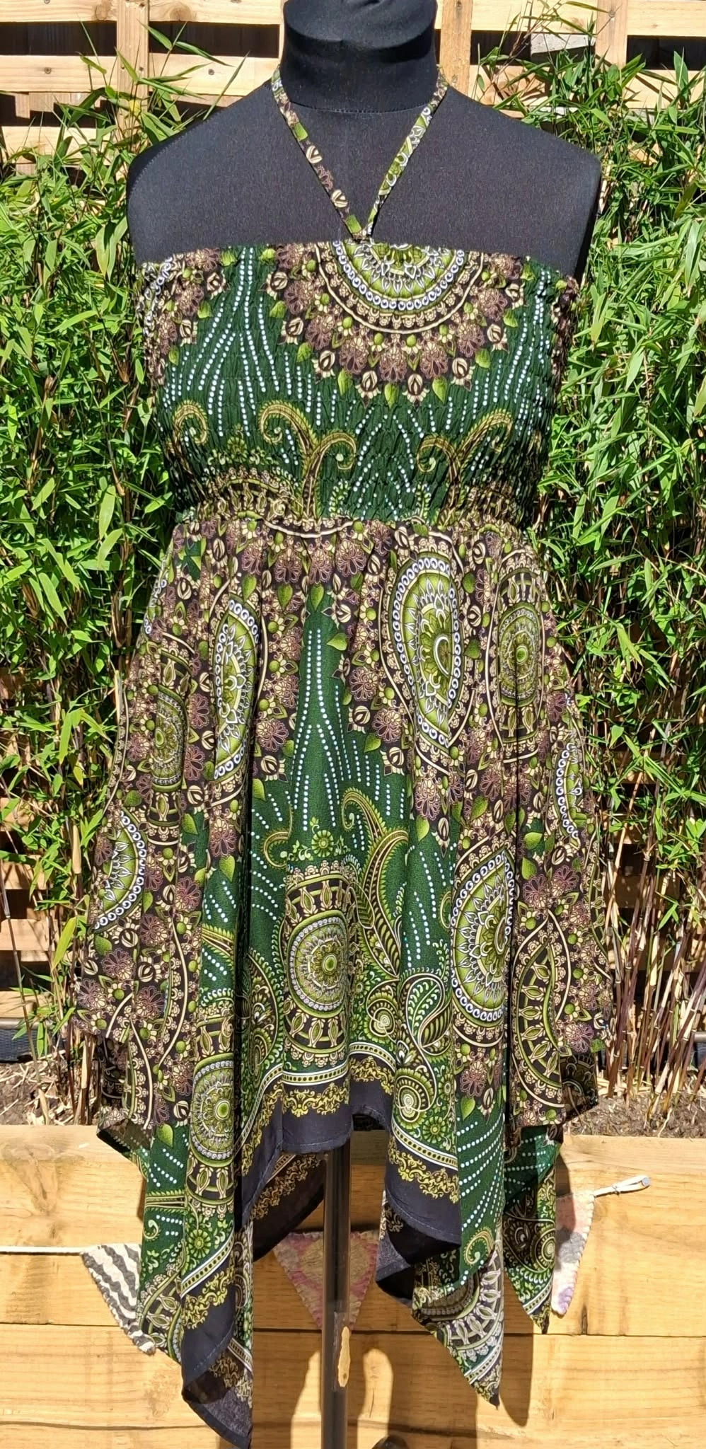 beautiful and floaty, mandala patterned, hanky hem, halter neck dresses, can also be worn as a skirt, deep shirred waist and top.