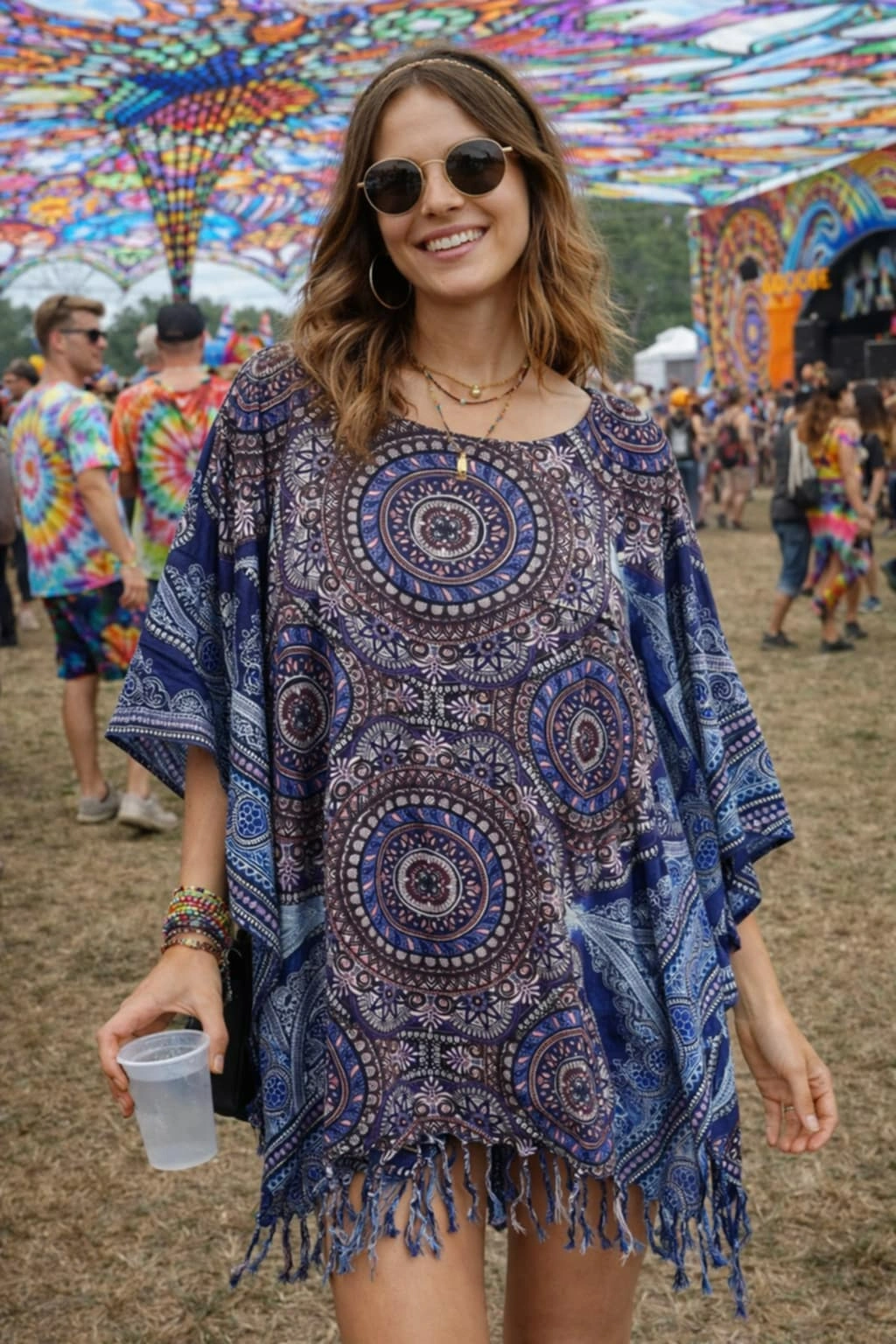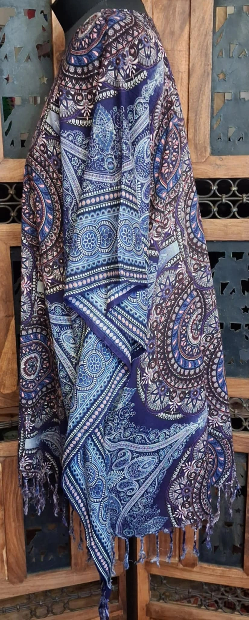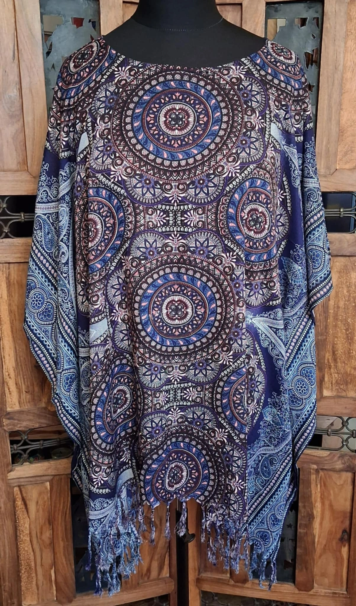 Mandala kaftan top, beautiful hues of blues and purples and pinks, finished off with fabulous tassels around the bottom, great with leggings and shorts.