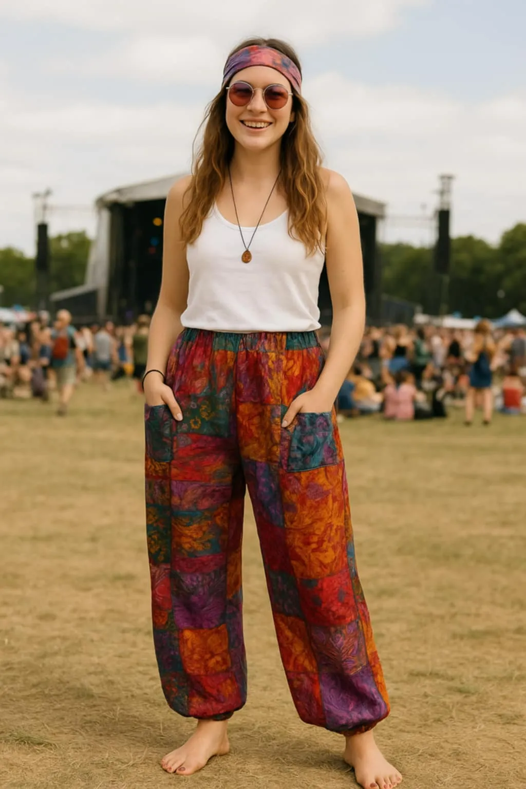 Super snuggly, patchwork blanket trousers, elasticated waist and ankles, 2 side pockets with wooden beads, super comfy and cosy.