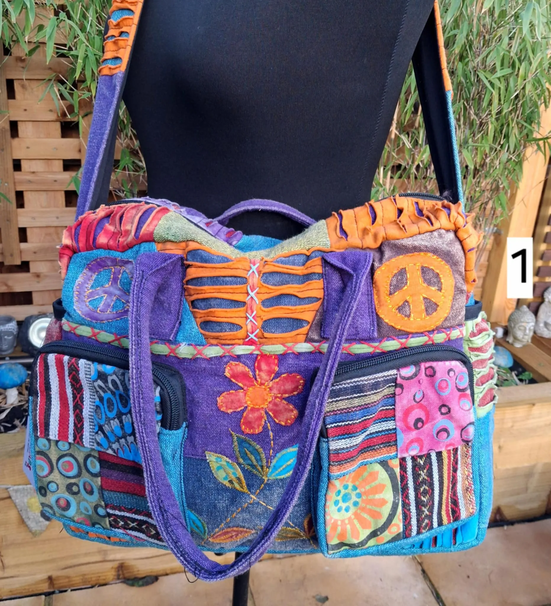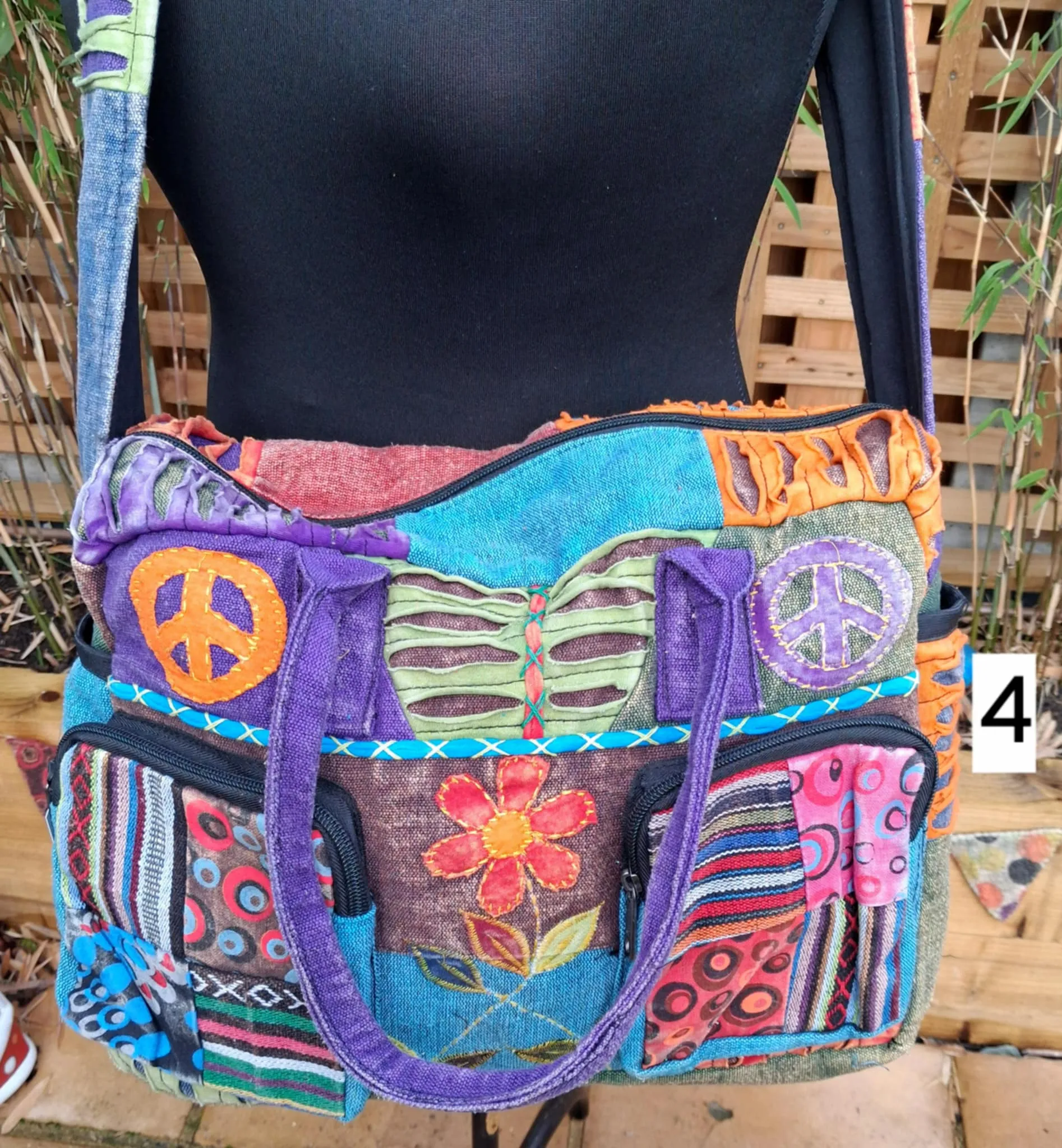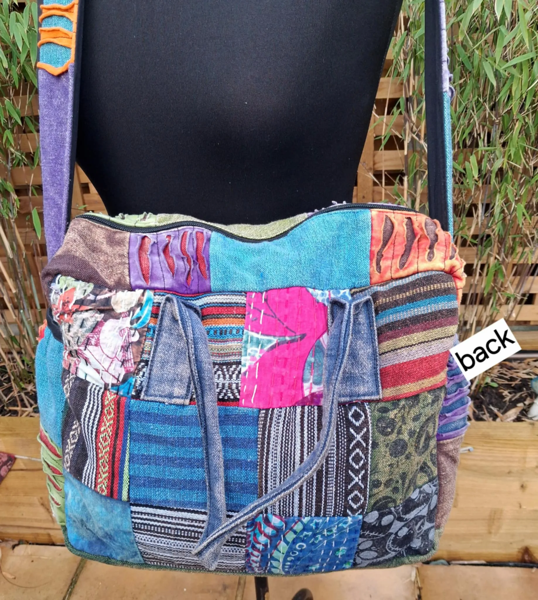 amazingly roomy, patchwork duffle bags, adjustable straps and two smaller handles to carry, two outside pockets, zipped top, leading to a roomy interior, great for overnight stays, or days out.