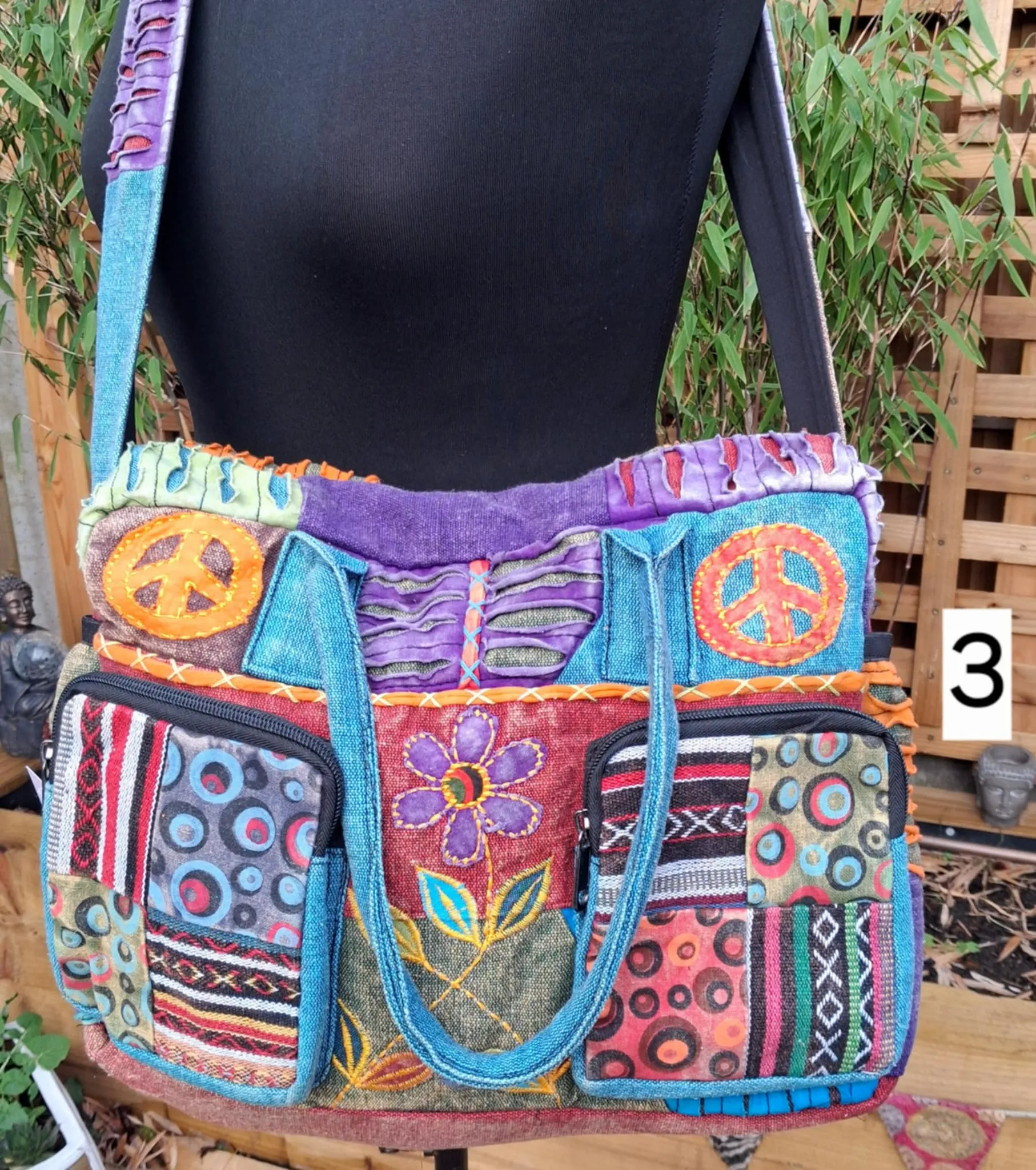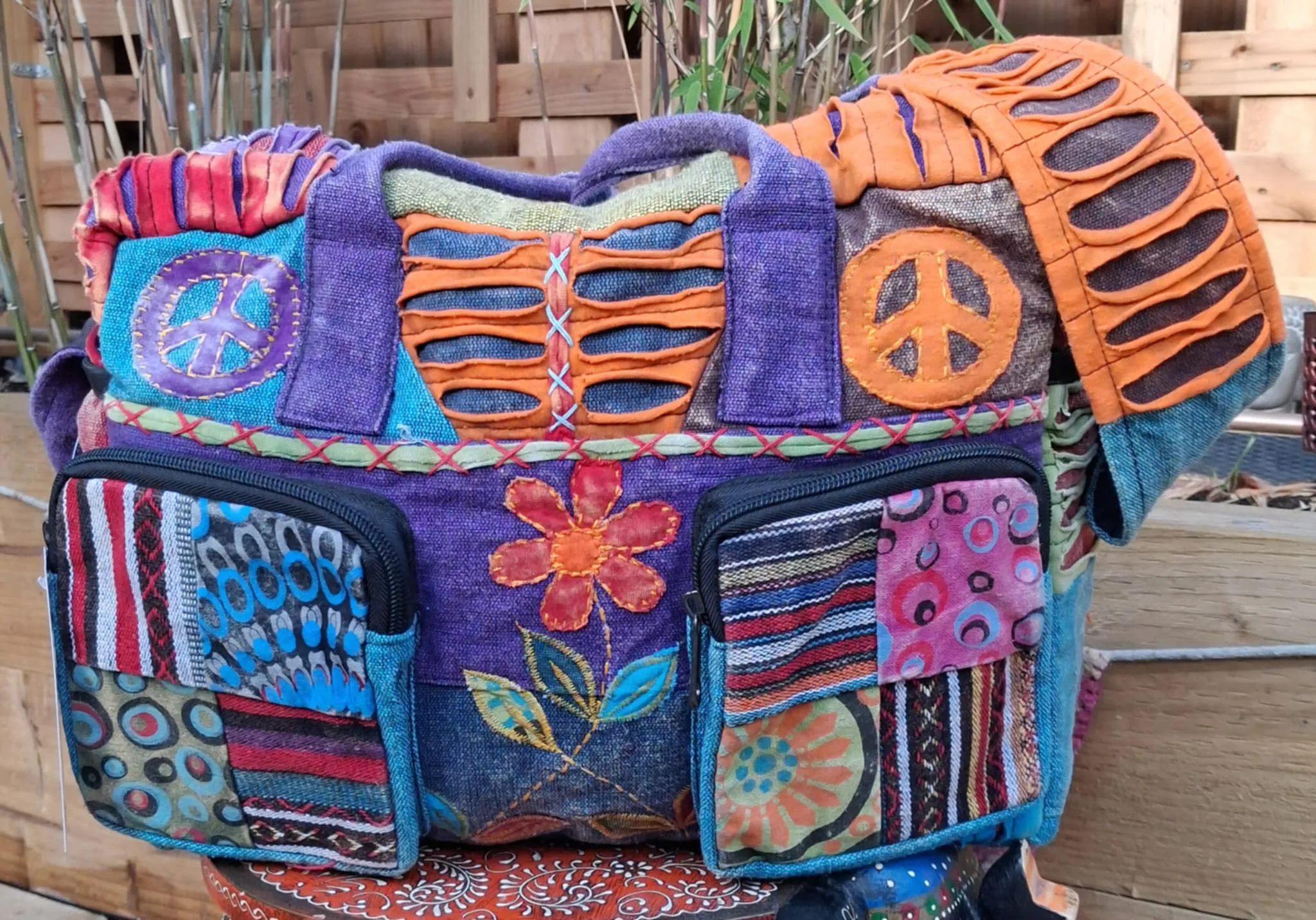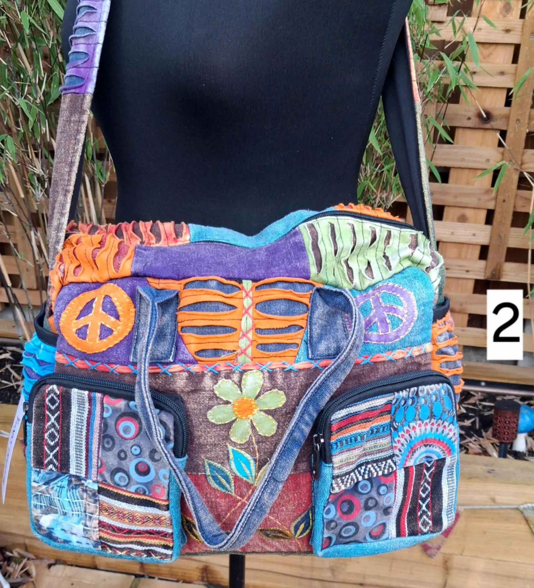 amazingly roomy, patchwork duffle bags, adjustable straps and two smaller handles to carry, two outside pockets, zipped top, leading to a roomy interior, great for overnight stays, or days out.