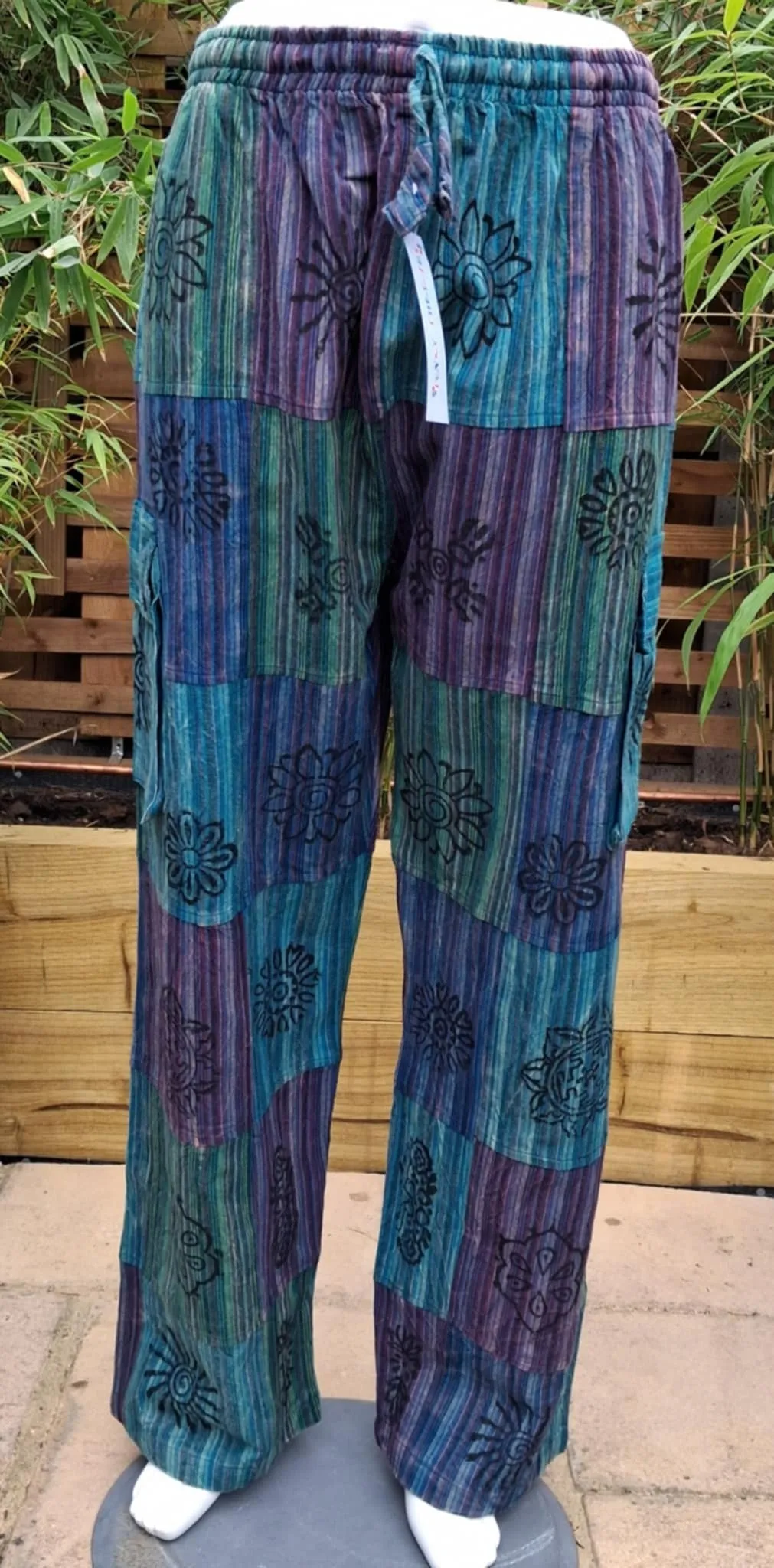 Patchwork hippy trousers, elasticated waist with pull ties to suit, 2 pockets and 2 large buttoned pockets on each side, a true hippy wardrobe staple!