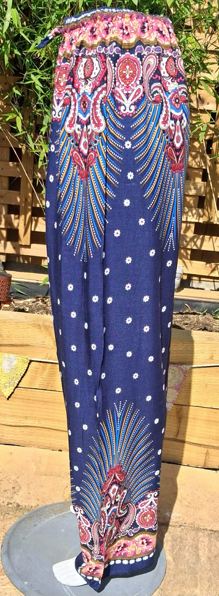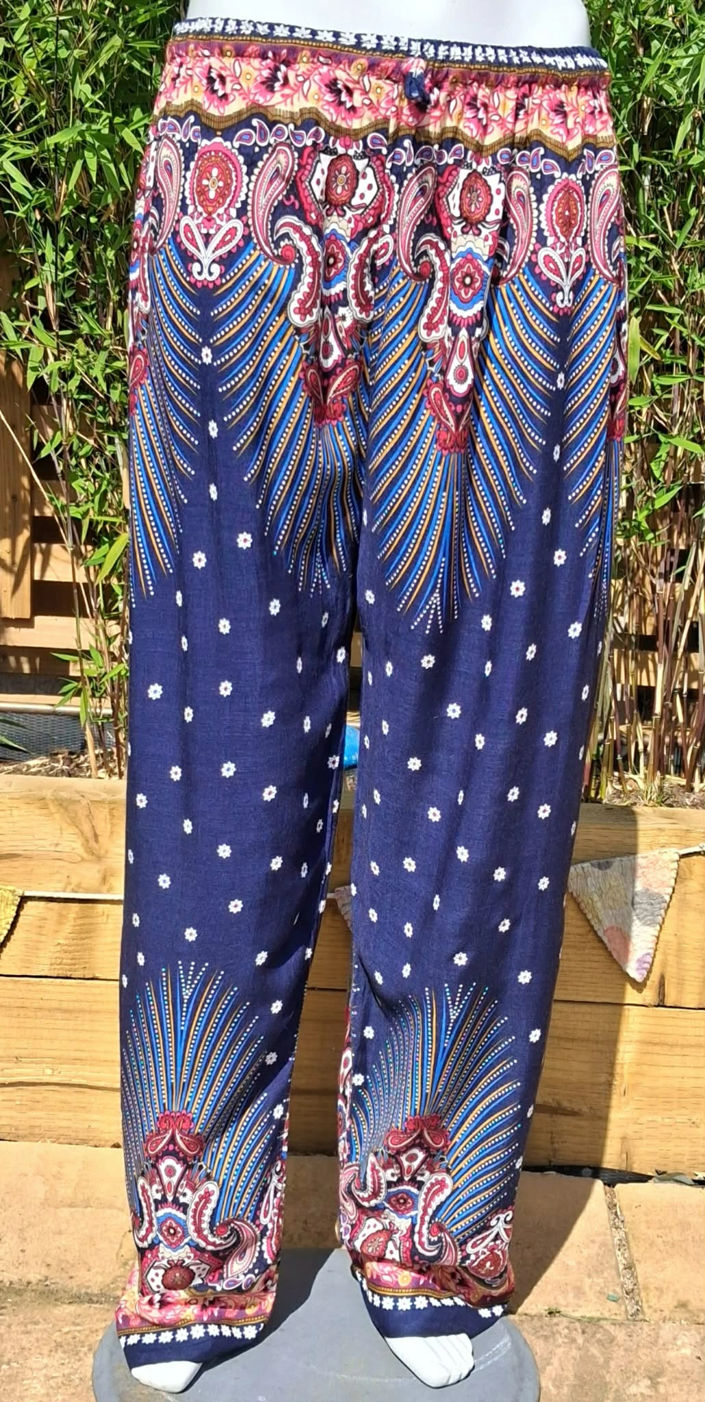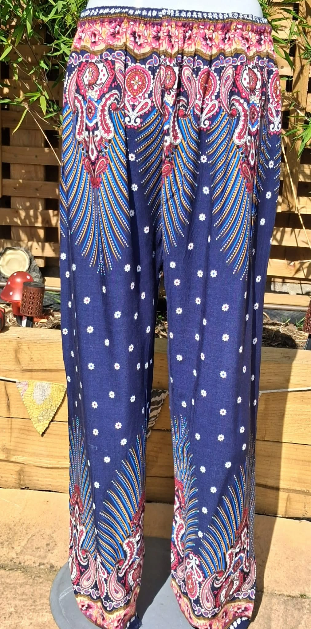 beautiful patterned, straight legged trousers, paisley and floral patterns, elasticated waist, soft and comfy to wear.