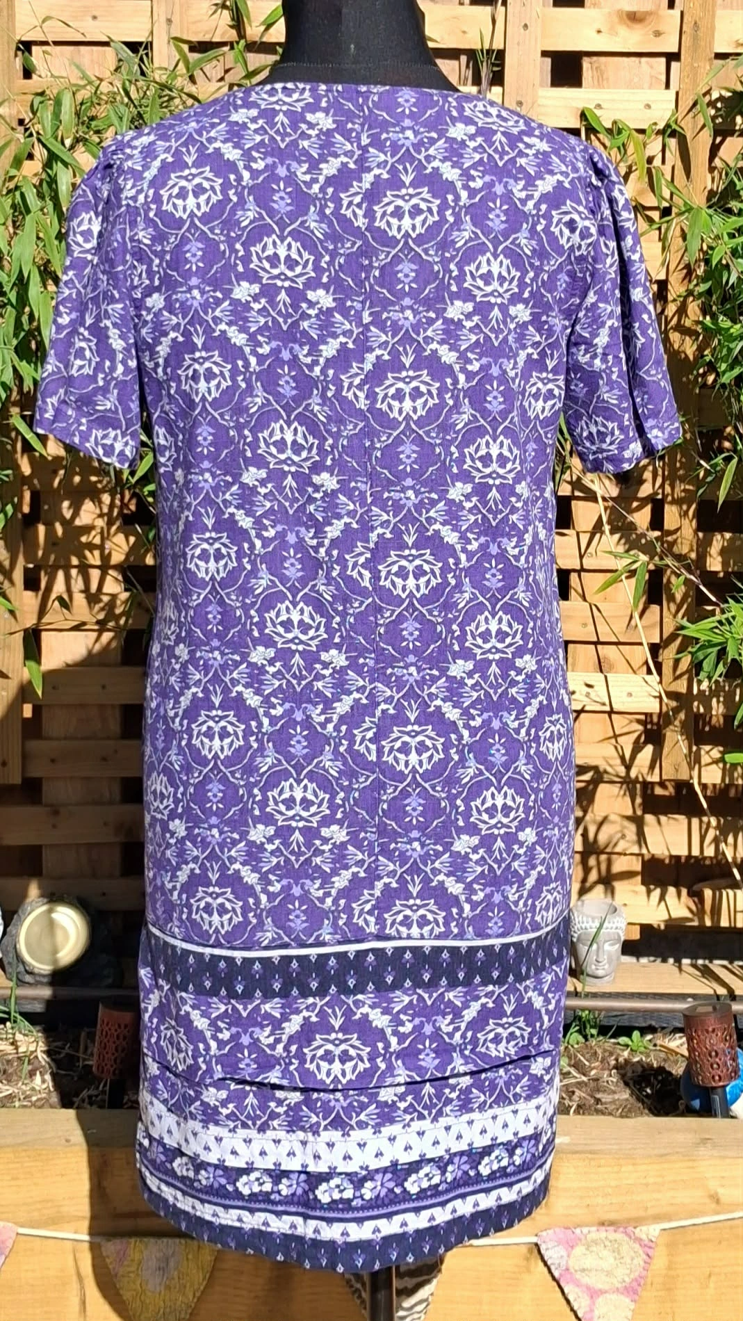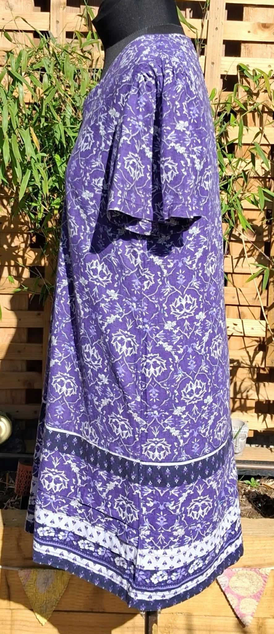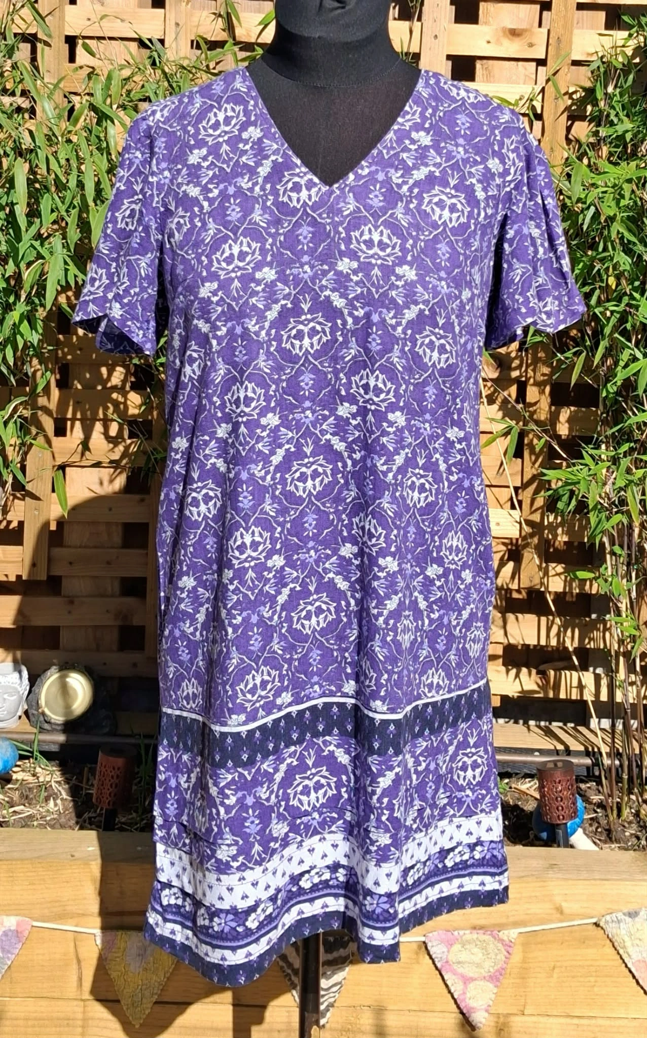 gorgeous, purple linen dress, V-necked, beautiful floaty short sleeves, great to wear from day to evening.