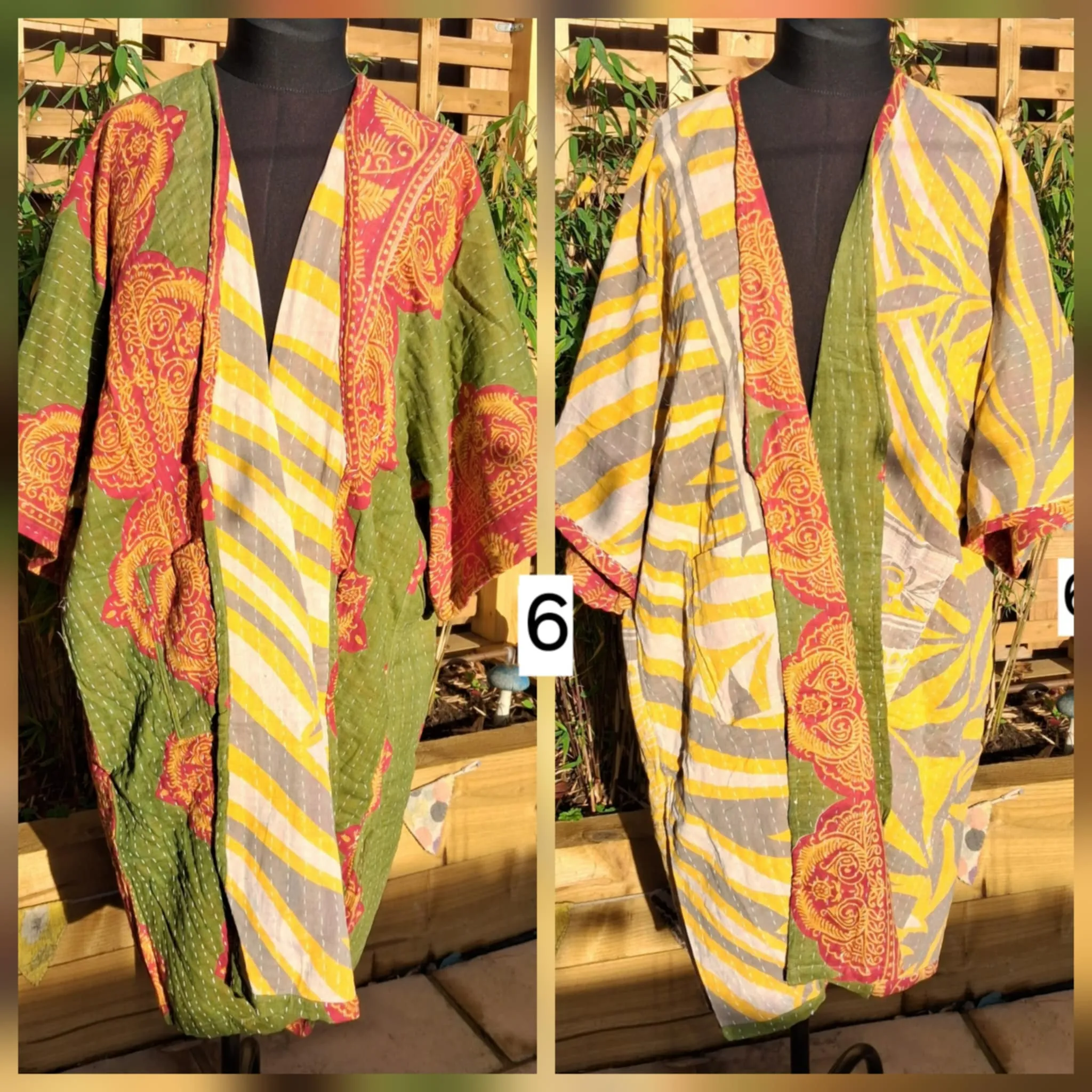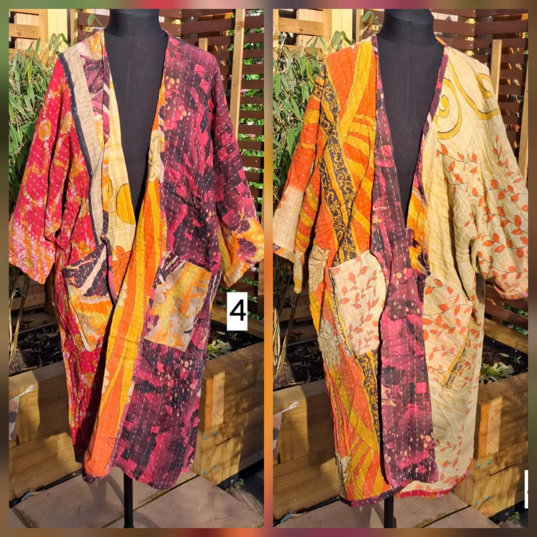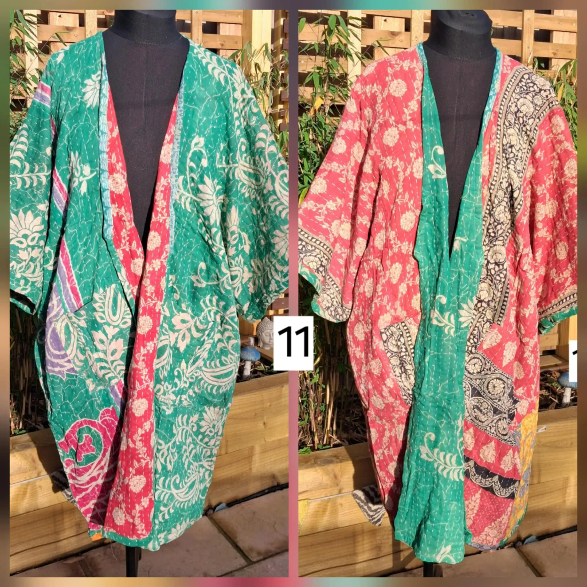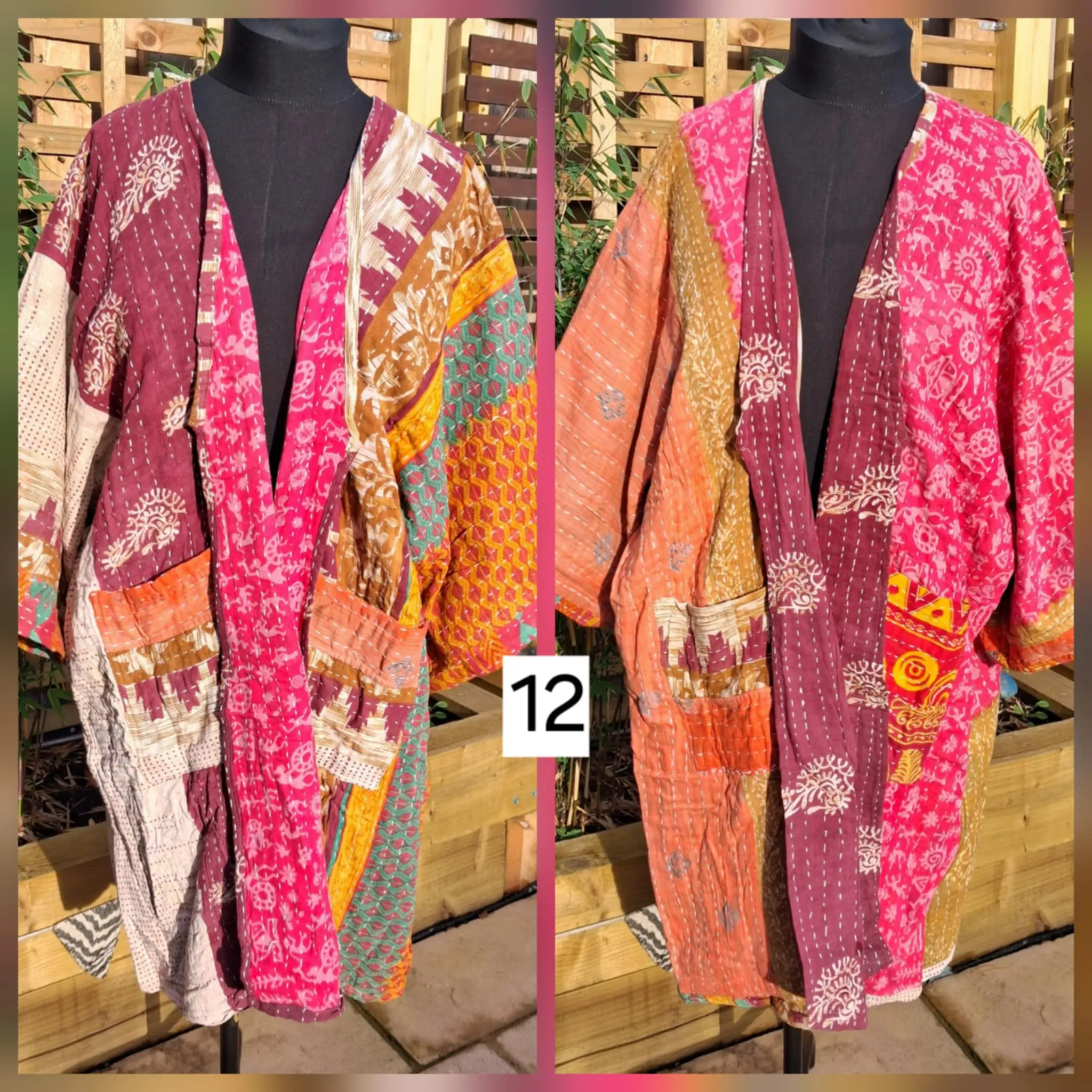 The most beautiful, fully reversable, recycled cotton, kantha overthrows. all one of a kind, stitched from 3 layers of vintage, cotton saris, creating a lightweight, yet cosy layer that moves with you like a second skin. perfect for festivals, forest walks, or just adding a splash of colour to your every day ritual. pockets on both sides so 2 jackets in one.