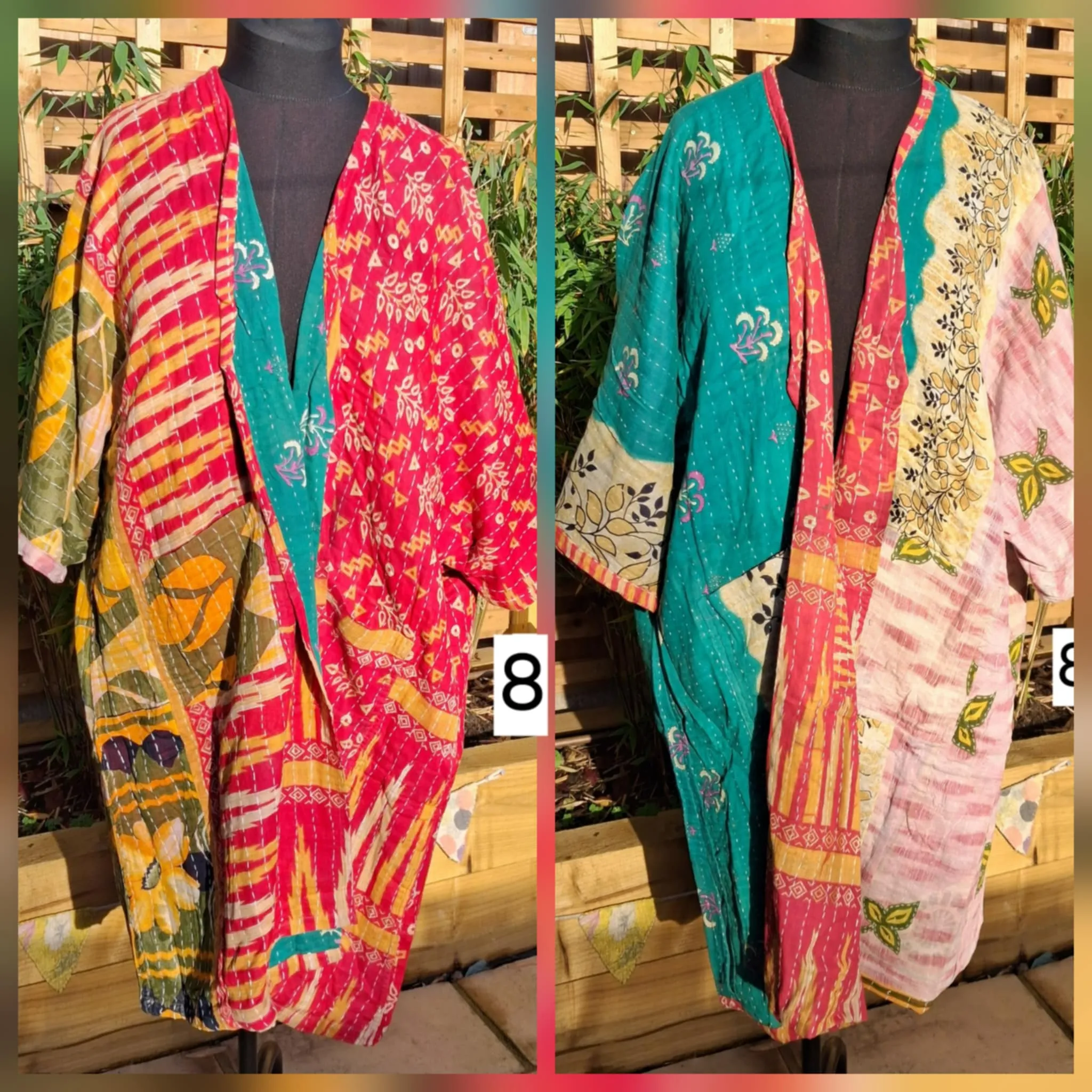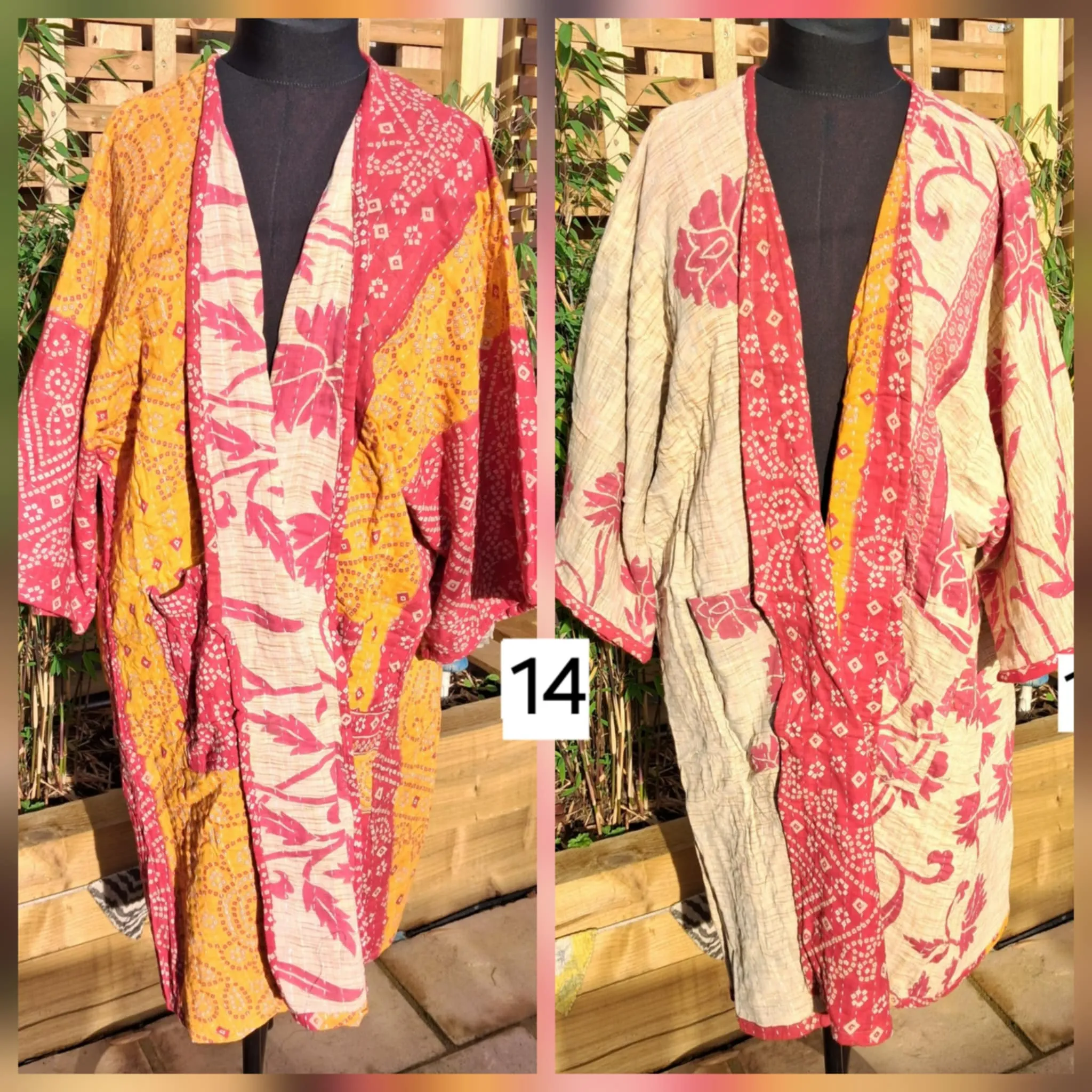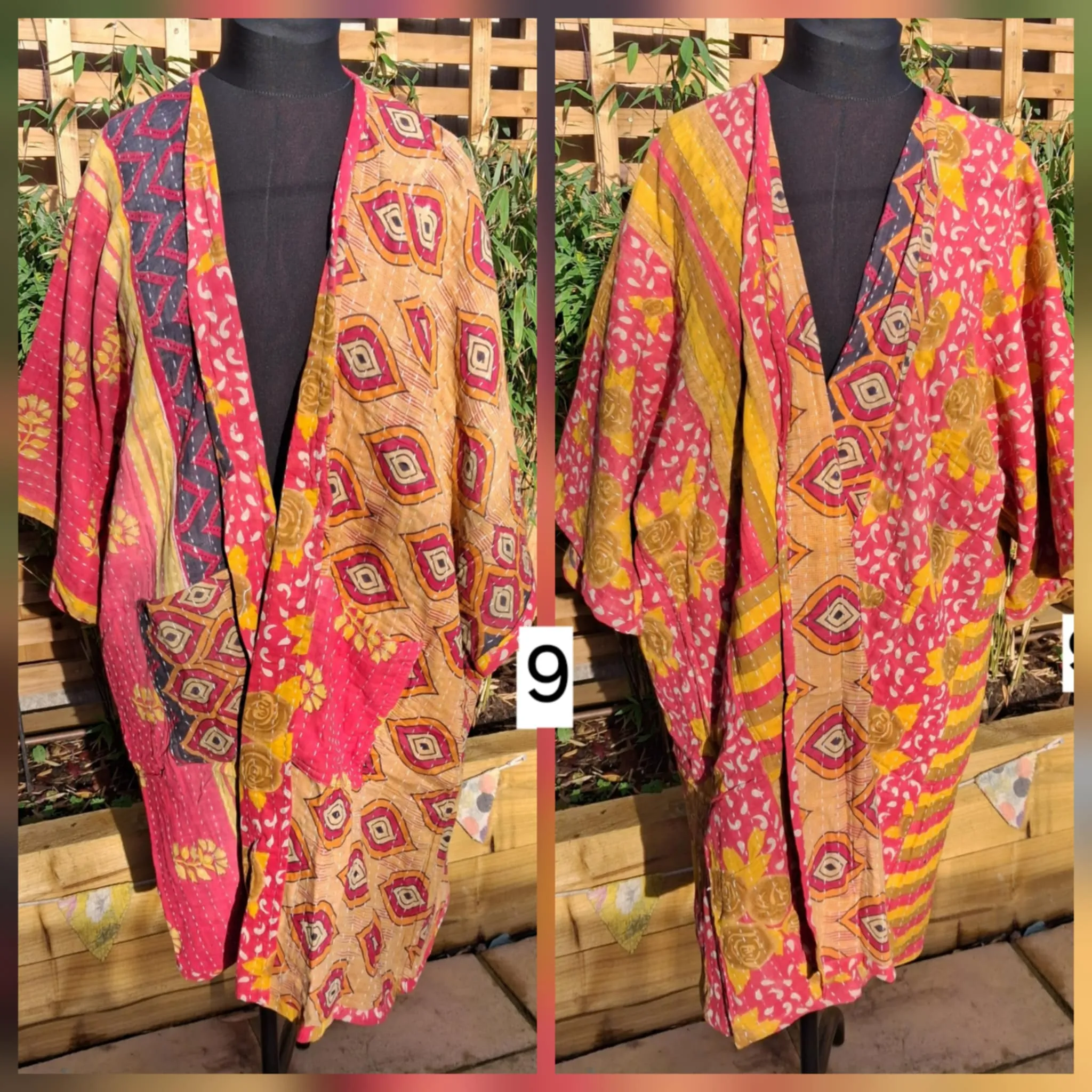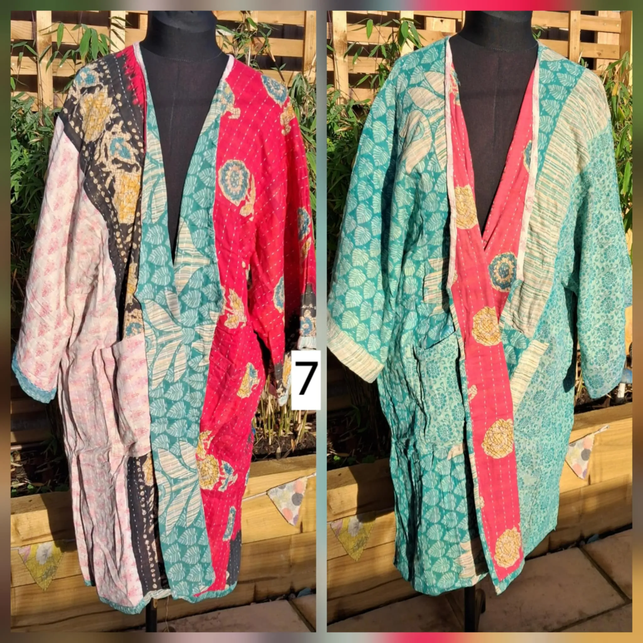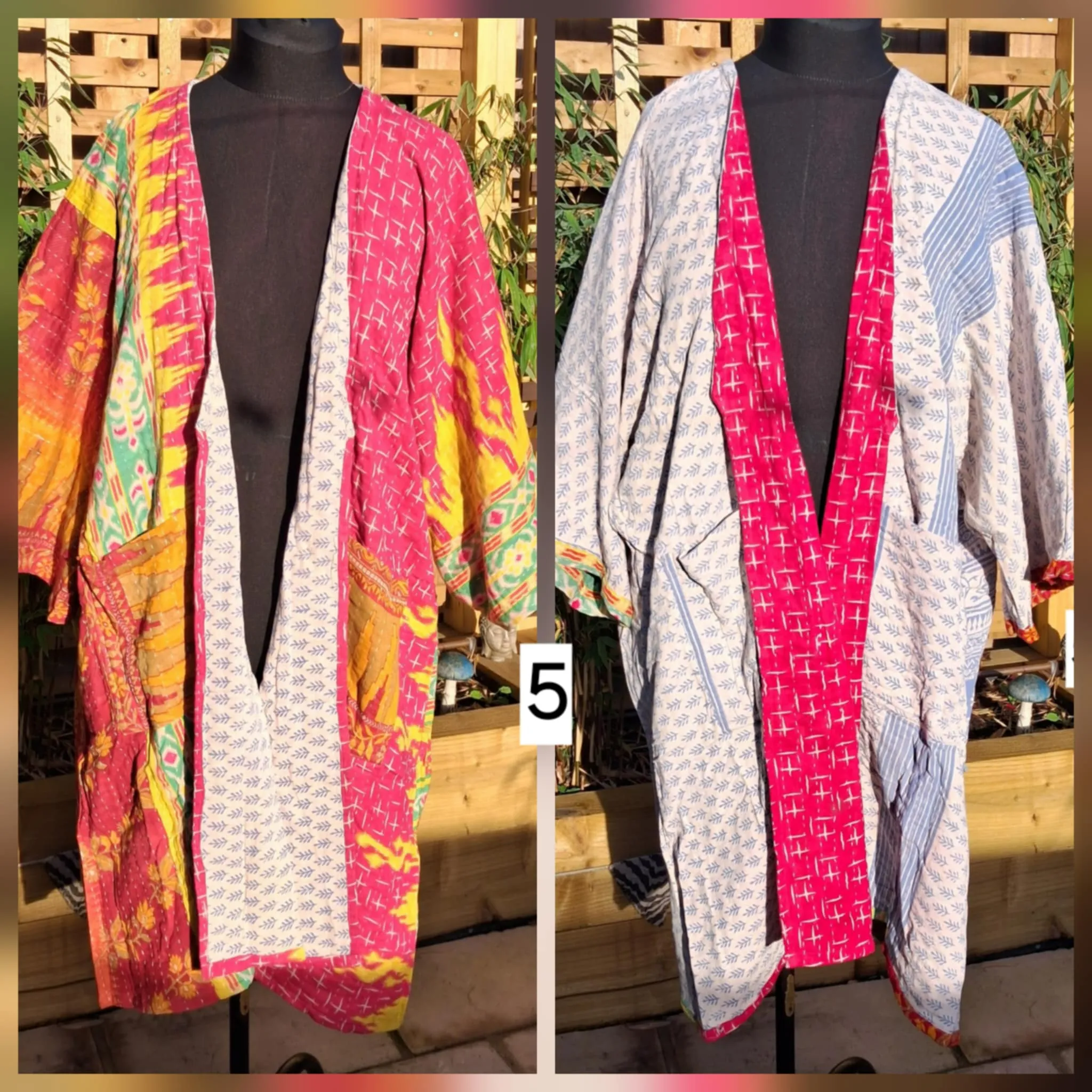 The most beautiful, fully reversable, recycled cotton, kantha overthrows. all one of a kind, stitched from 3 layers of vintage, cotton saris, creating a lightweight, yet cosy layer that moves with you like a second skin. perfect for festivals, forest walks, or just adding a splash of colour to your every day ritual. pockets on both sides so 2 jackets in one.
