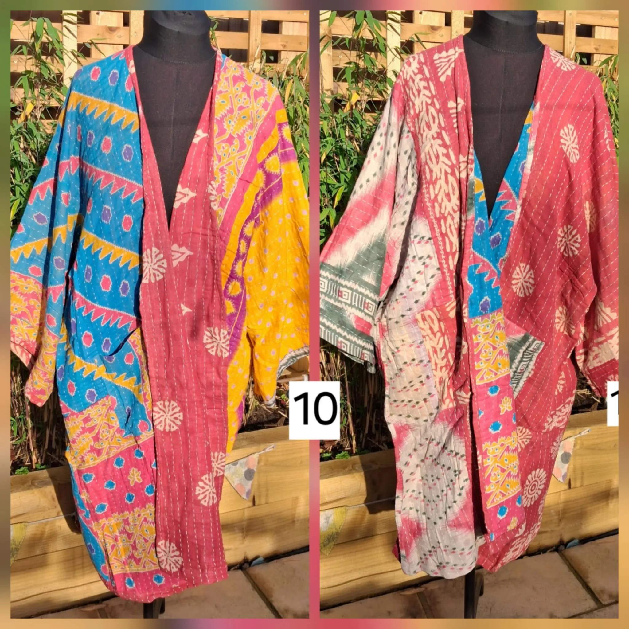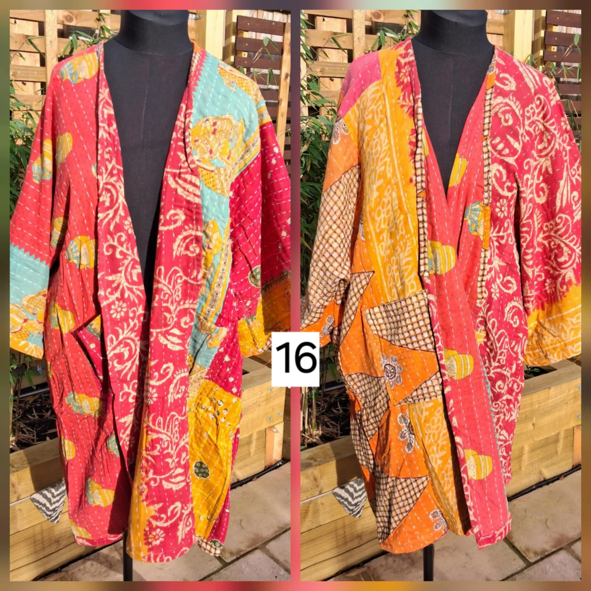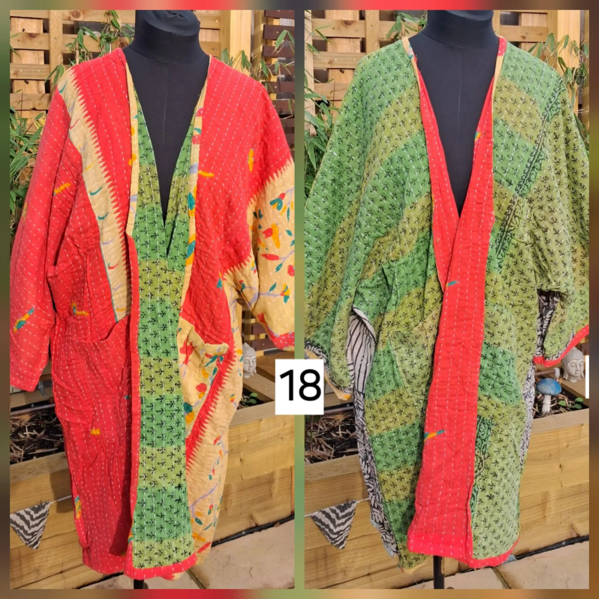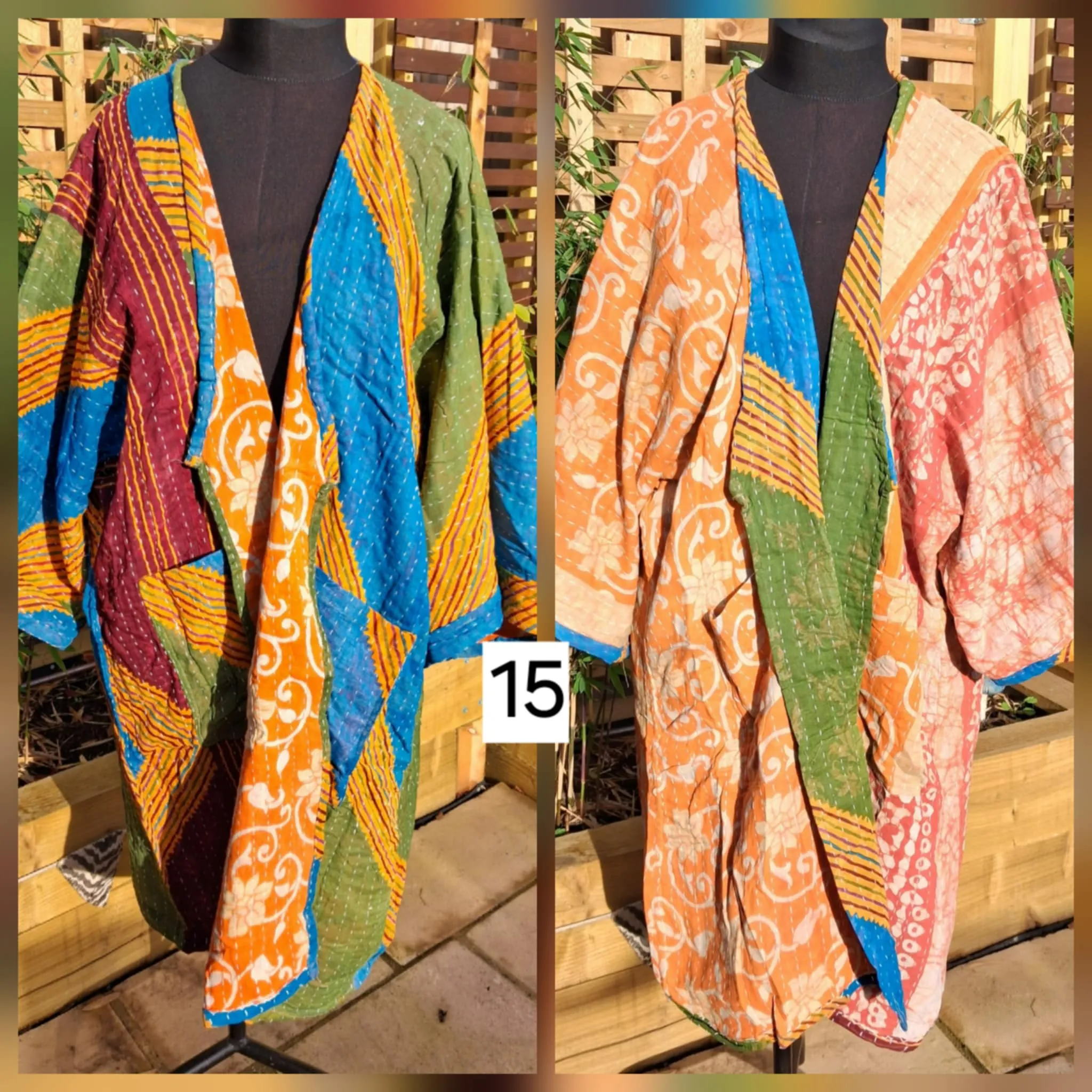 The most beautiful, fully reversable, recycled cotton, kantha overthrows. all one of a kind, stitched from 3 layers of vintage, cotton saris, creating a lightweight, yet cosy layer that moves with you like a second skin. perfect for festivals, forest walks, or just adding a splash of colour to your every day ritual. pockets on both sides so 2 jackets in one.