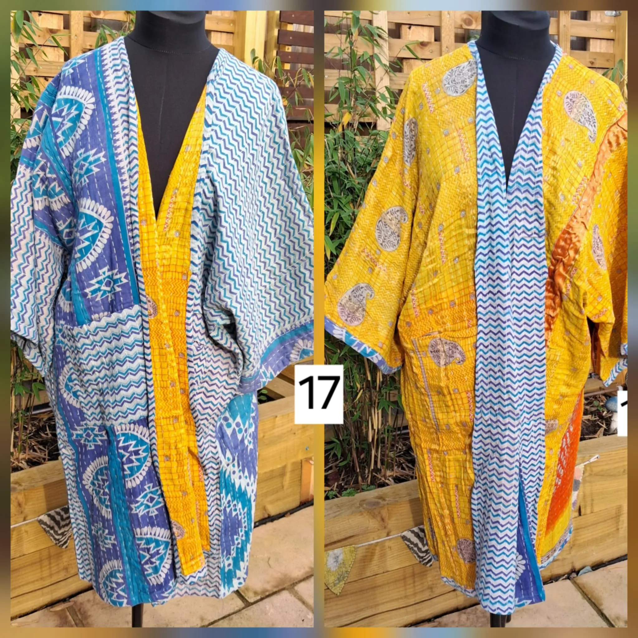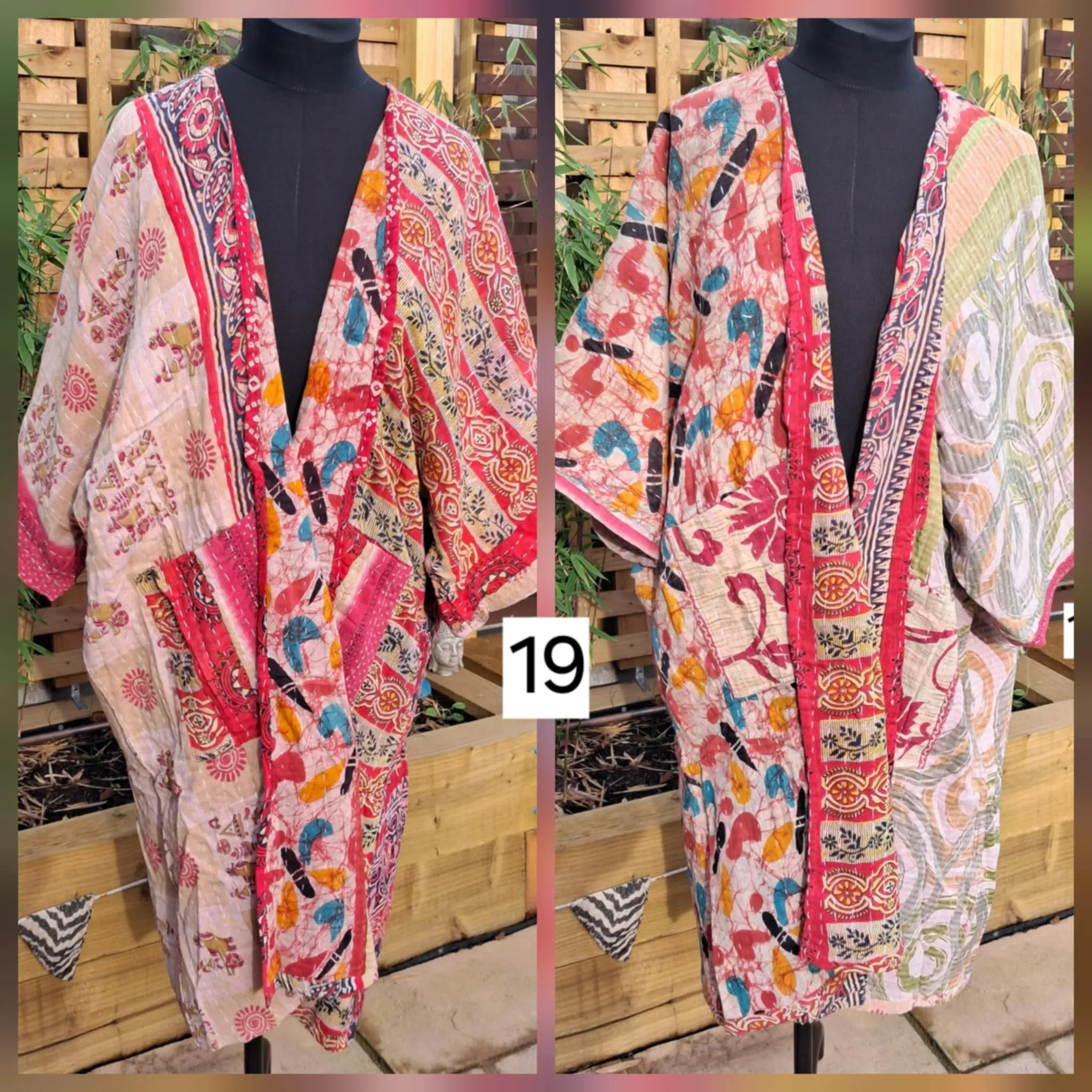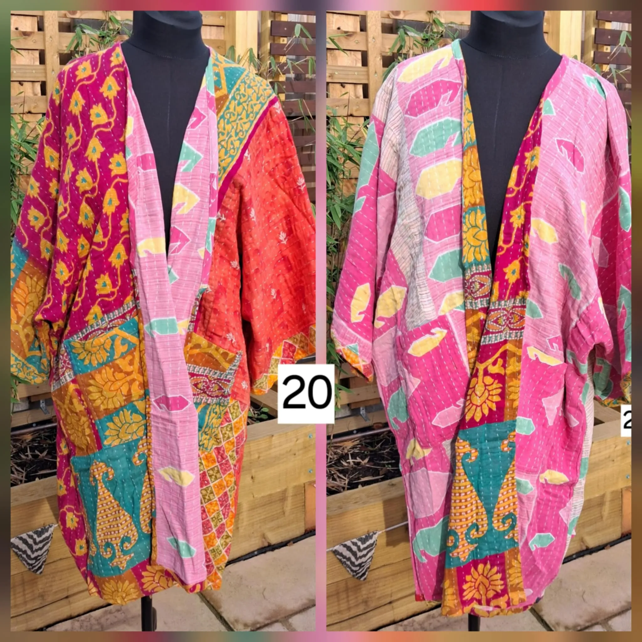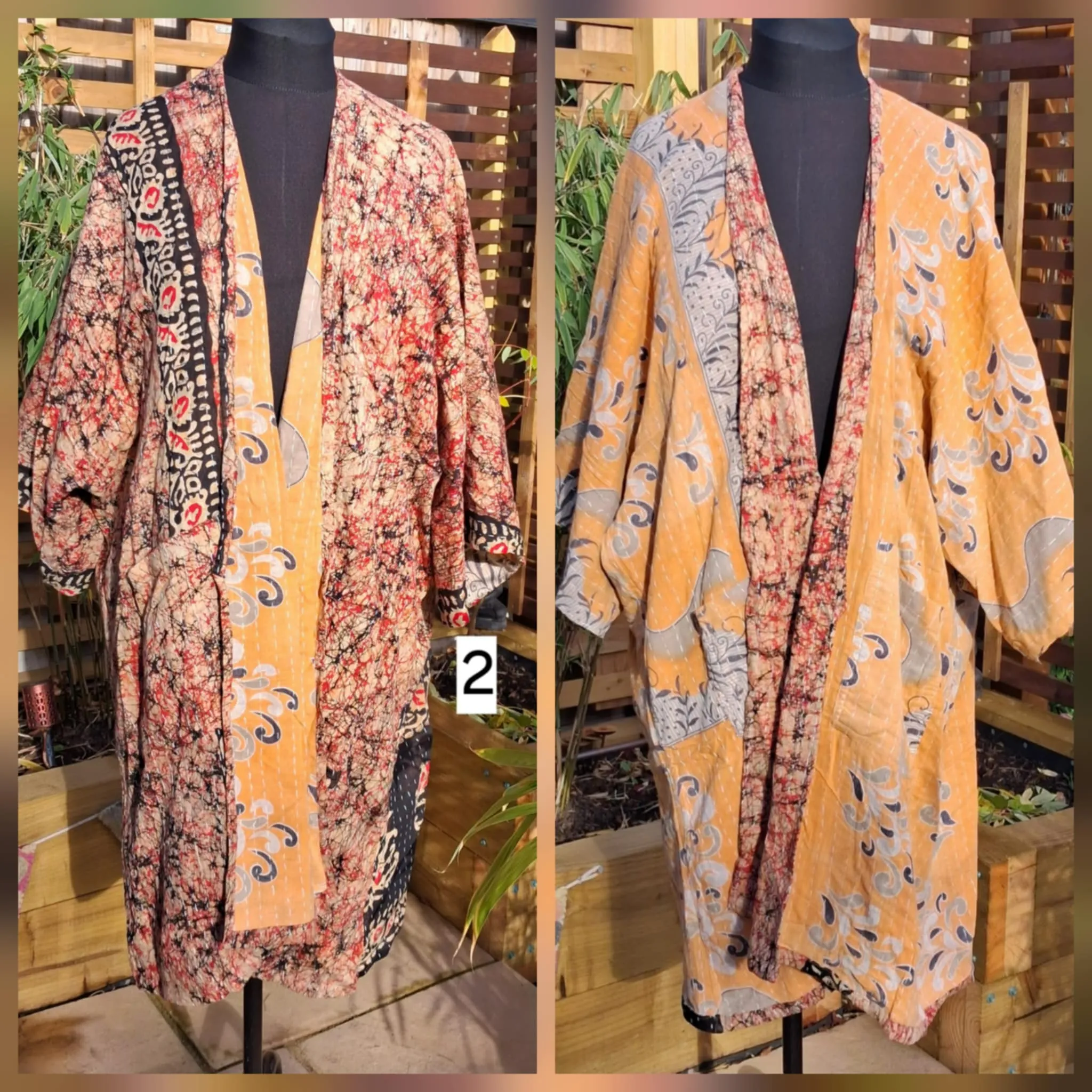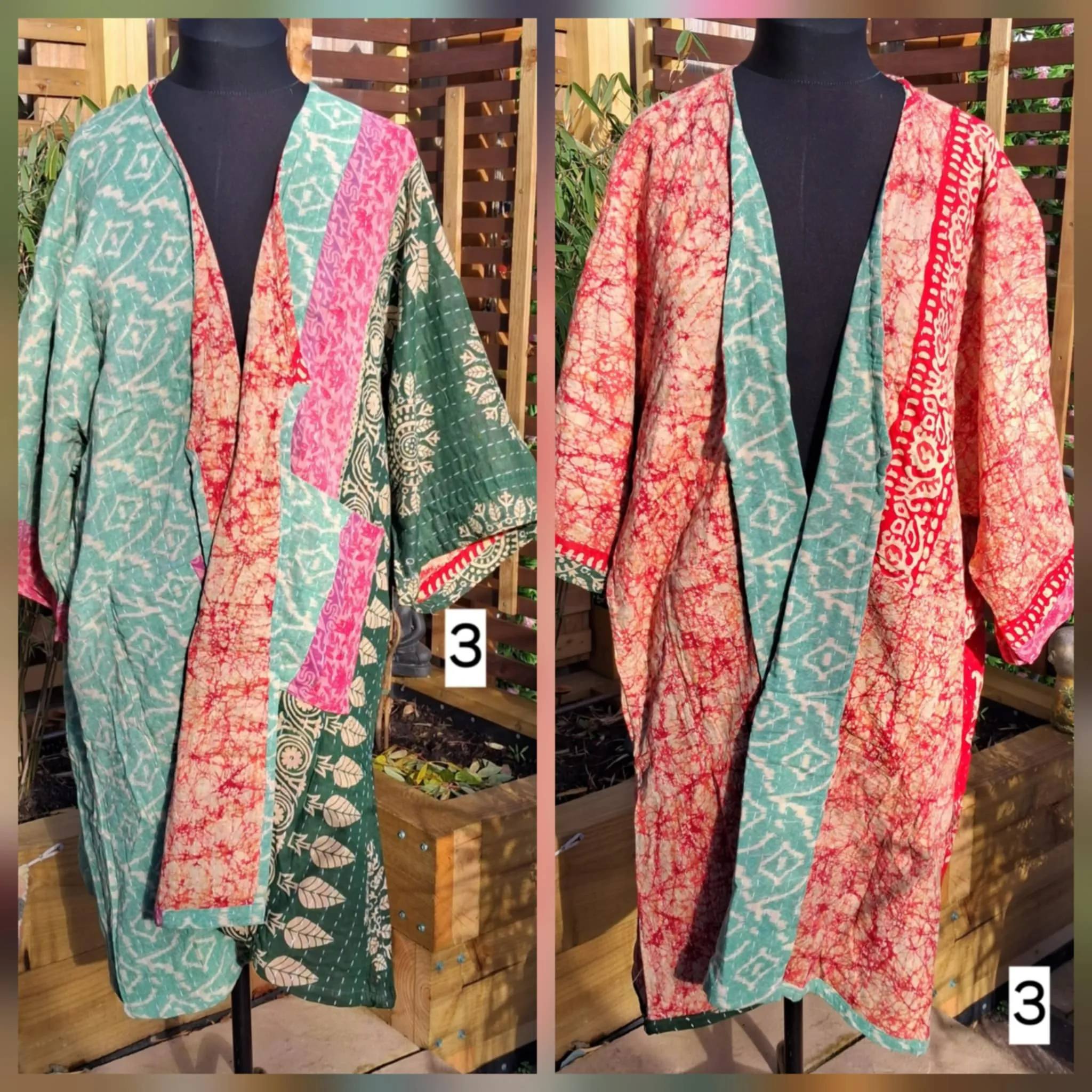 The most beautiful, fully reversable, recycled cotton, kantha overthrows. all one of a kind, stitched from 3 layers of vintage, cotton saris, creating a lightweight, yet cosy layer that moves with you like a second skin. perfect for festivals, forest walks, or just adding a splash of colour to your every day ritual. pockets on both sides so 2 jackets in one.