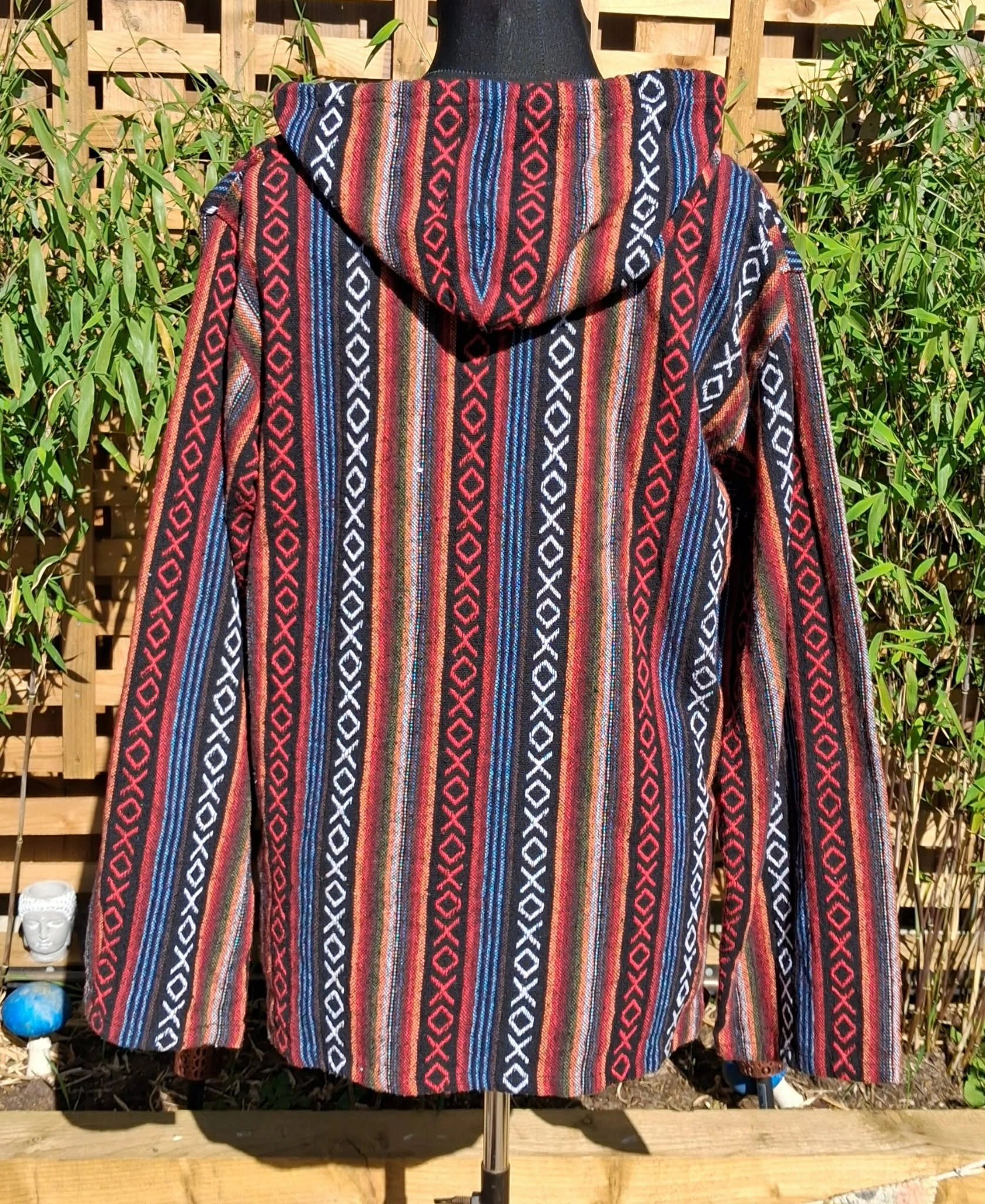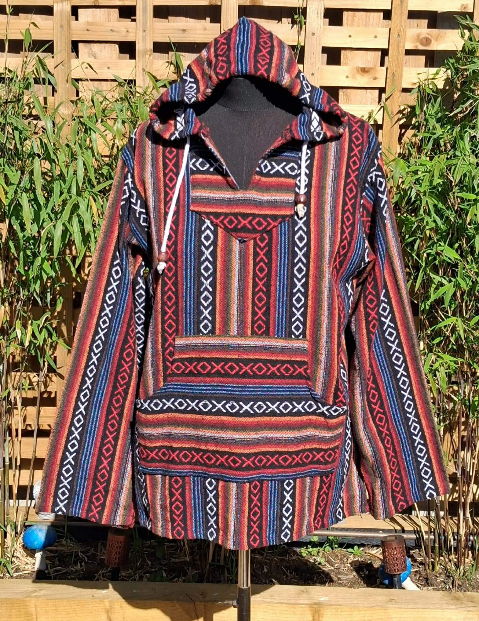 funky, stripey, baja hoodie, long sleeves, a hood, and a generous kangaroo pocket, great for snuggly evenings around the campfire.