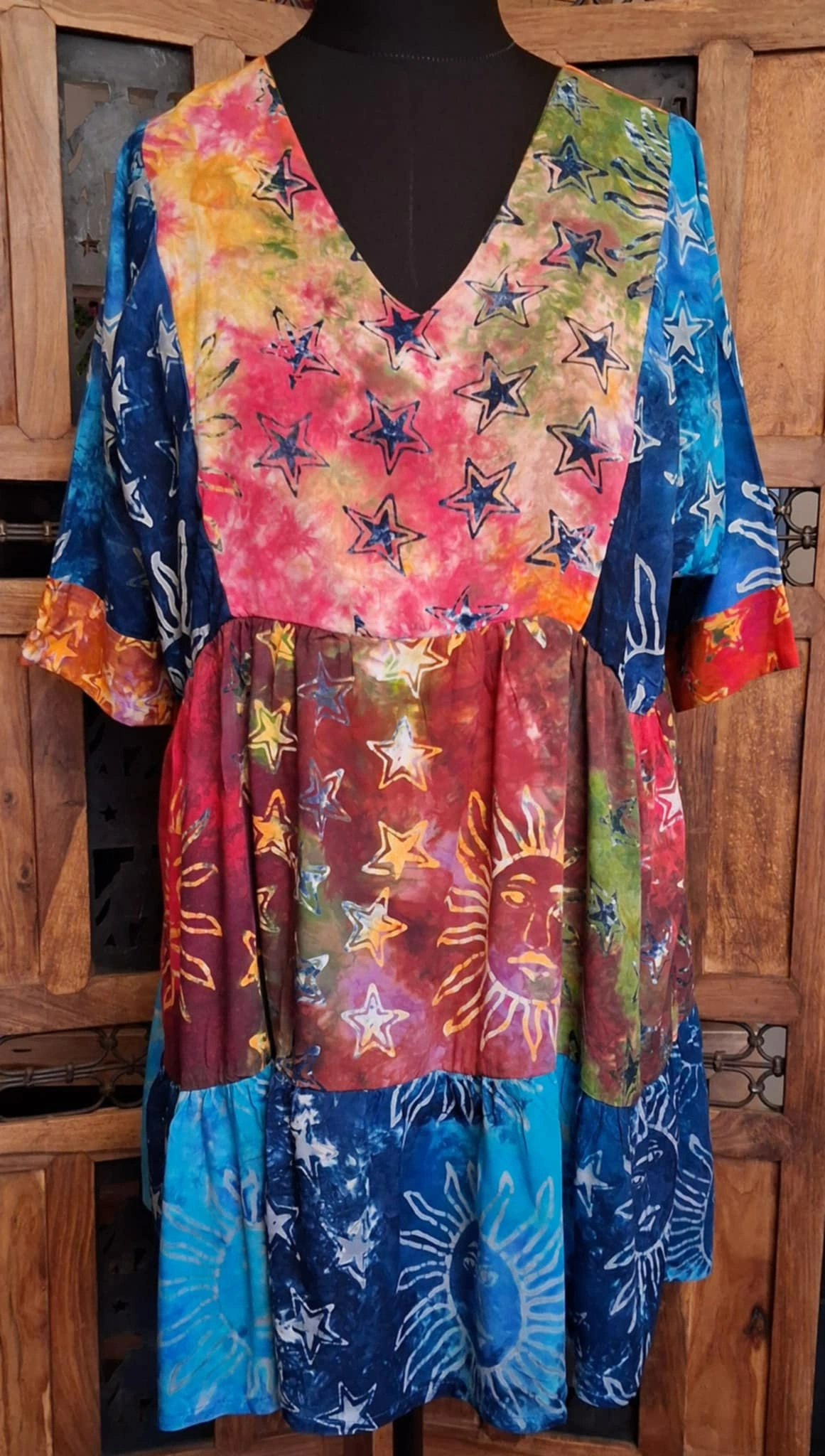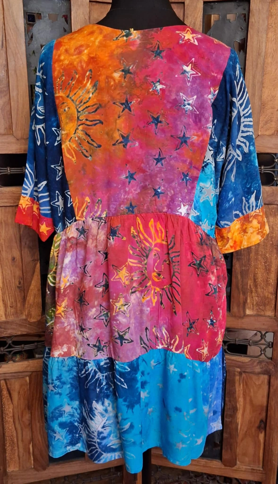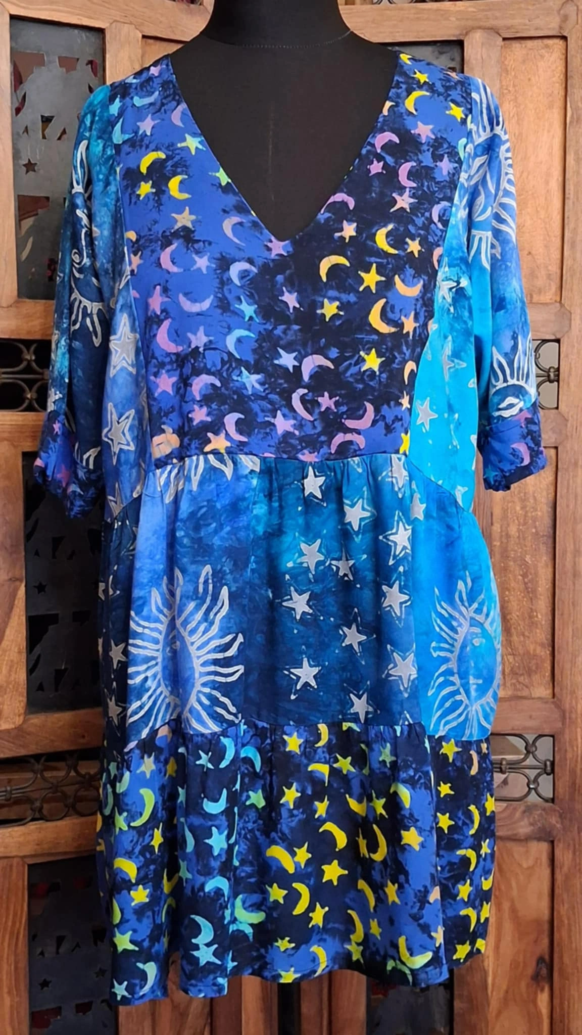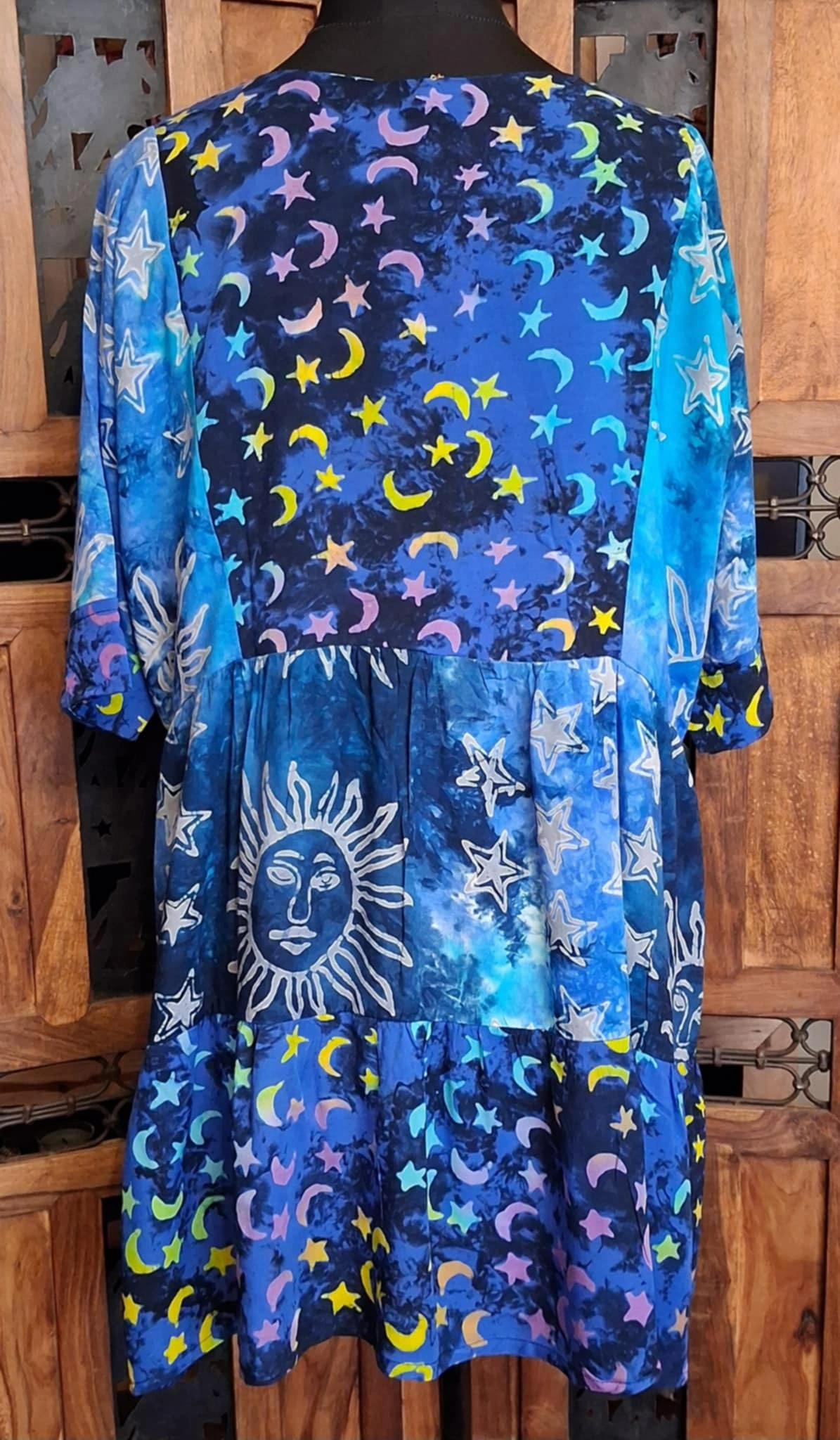 Beautiful, sun and moon, smock dresses, loose fitting, tie dye with beautiful sun and moon designs,  V-necked. definitely overflowing with hippy vibes.
